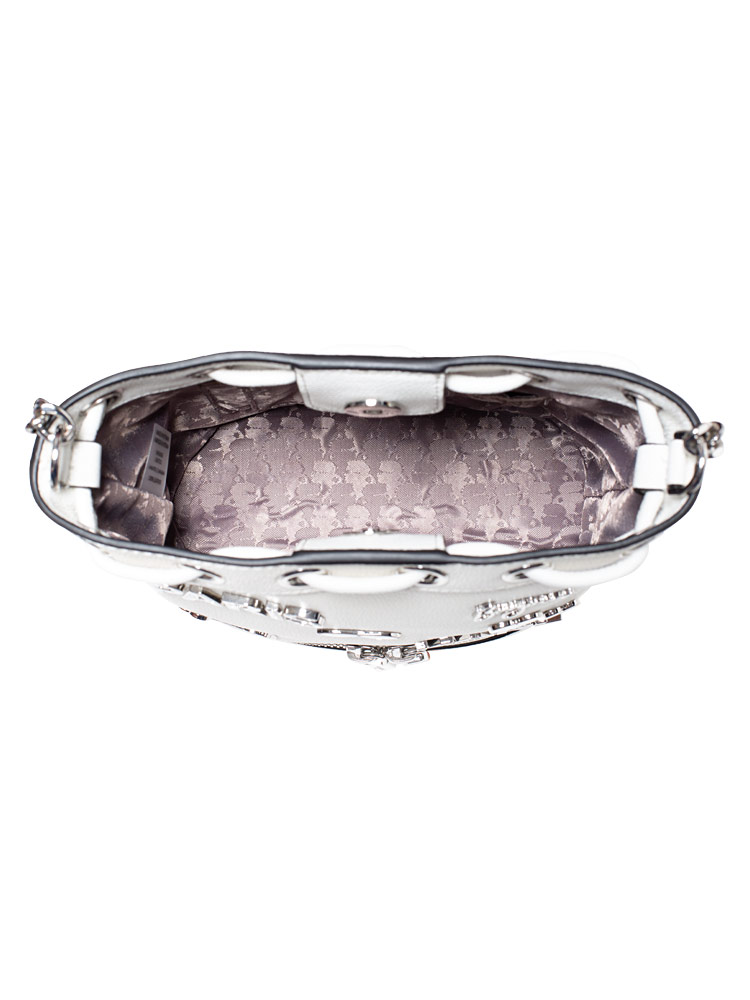 Made of pebbled leather. The bag features a drawstring with magnetic closure that opens to polyester lining with four card slots, one slip pocket, exterior one zip compartment, adjustable strap.