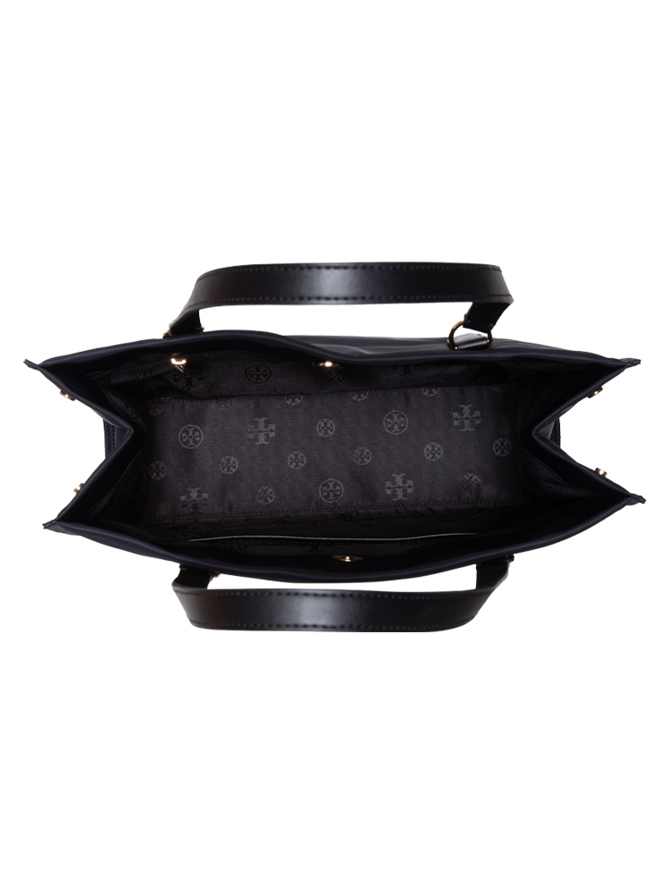 Made of nylon and leather trim. The bag features a magnetic closure that opens to fabric lining with one zip pocket, one slip pocket, double handles drop 24 cm.