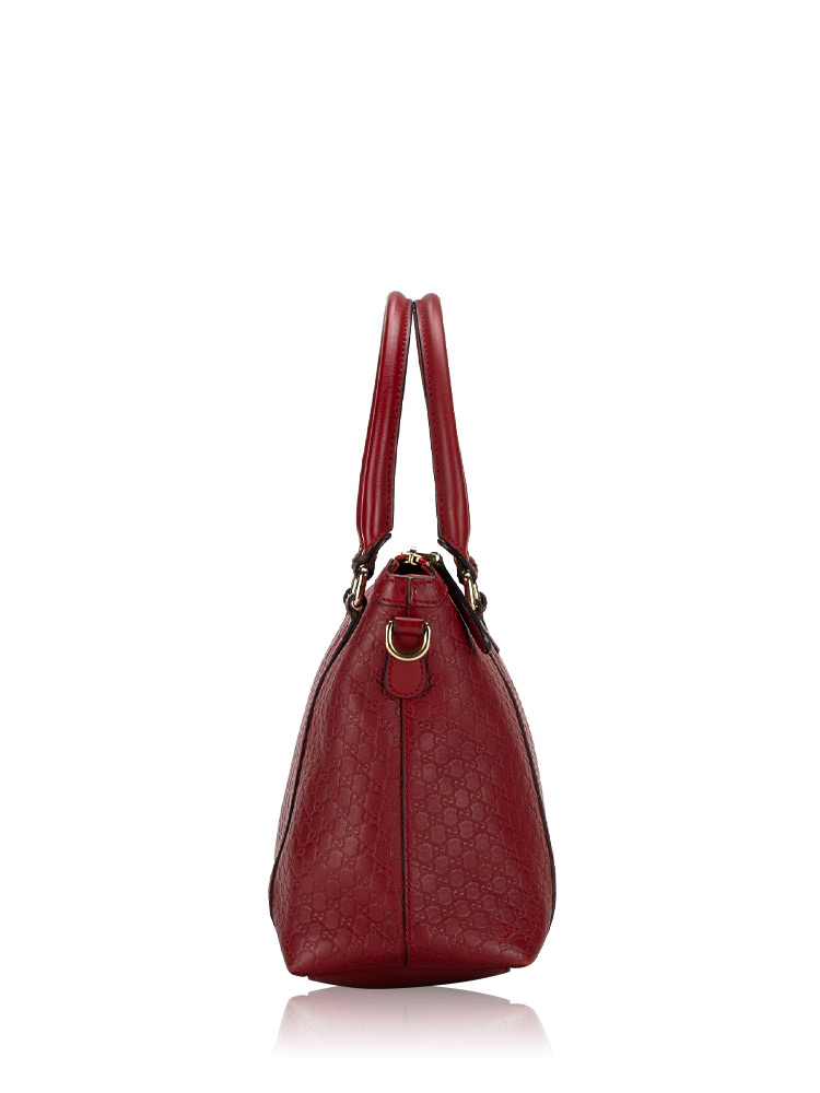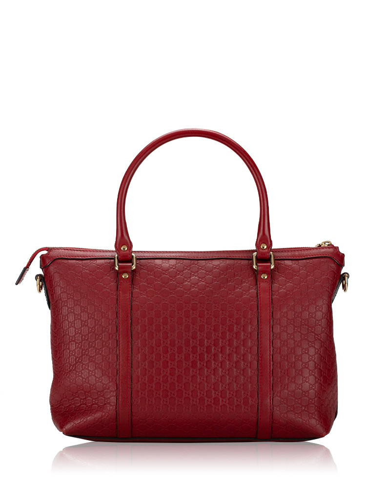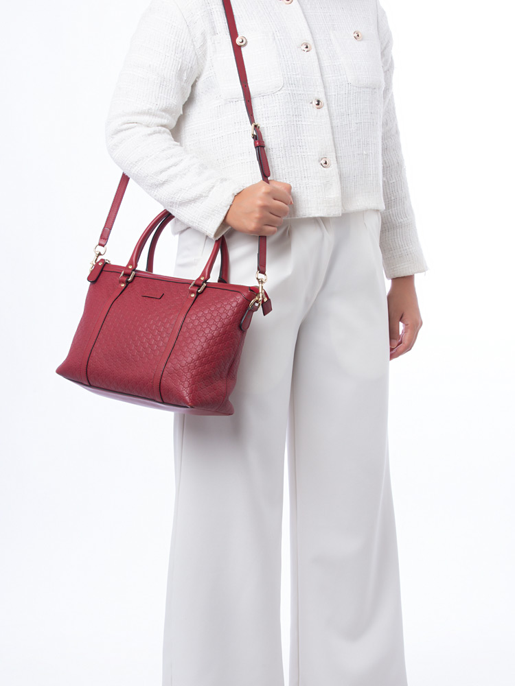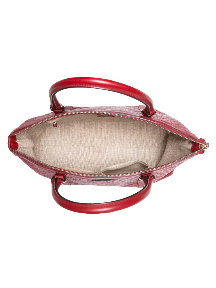 This bag is crafted of calfskin embossed leather material. It features leather trim, double top handles, an optional shoulder strap. The top zipper opens to a fabric lining with slip and zipper pockets.