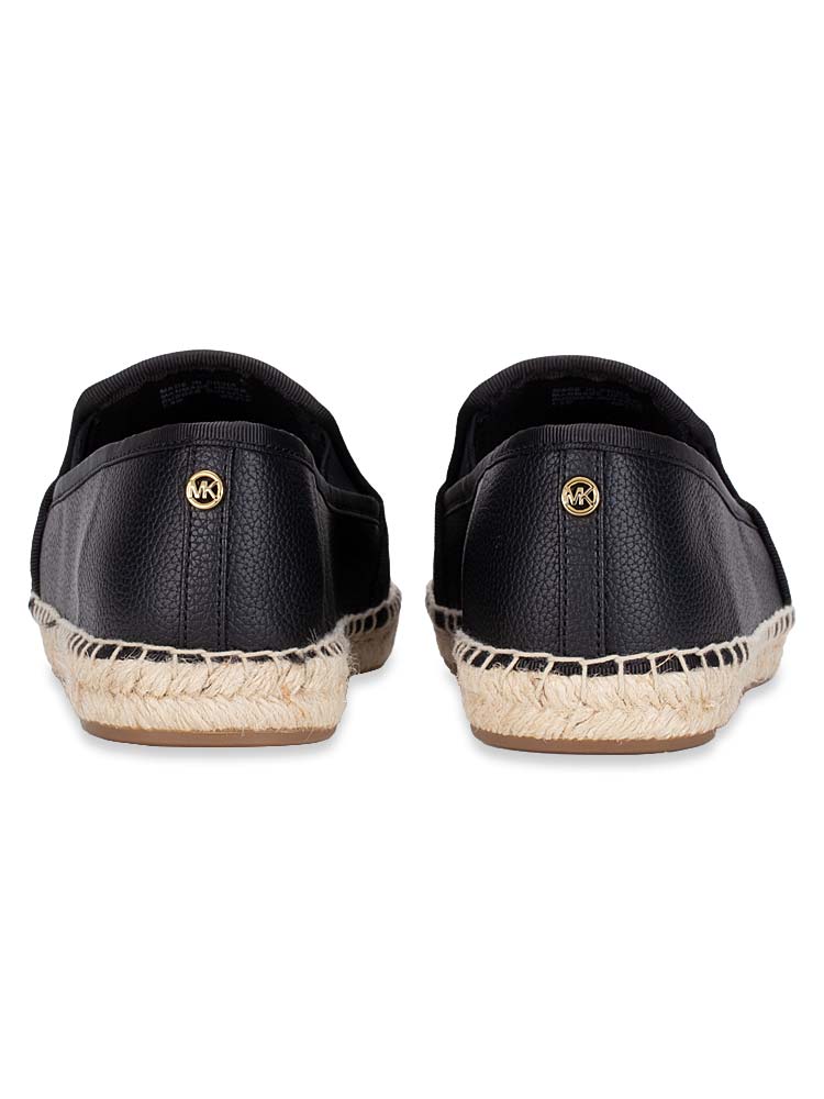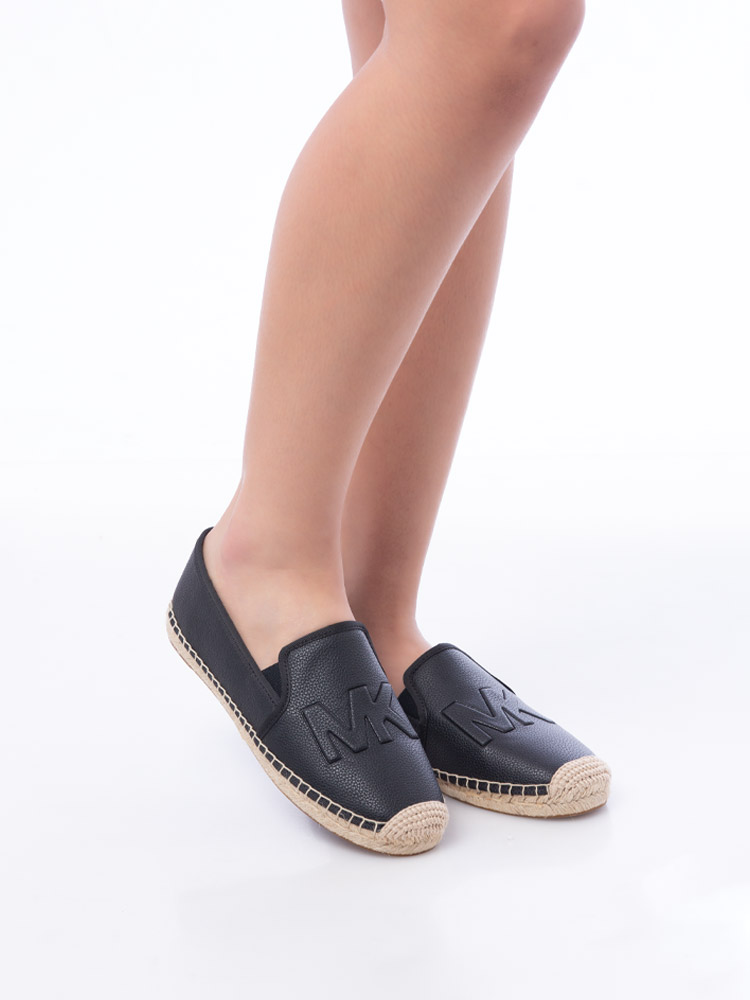 Crafted of smooth leather and espadrille, rubber outsole, the shoe features gold tone hardware, closed round toe, and MK logo on.