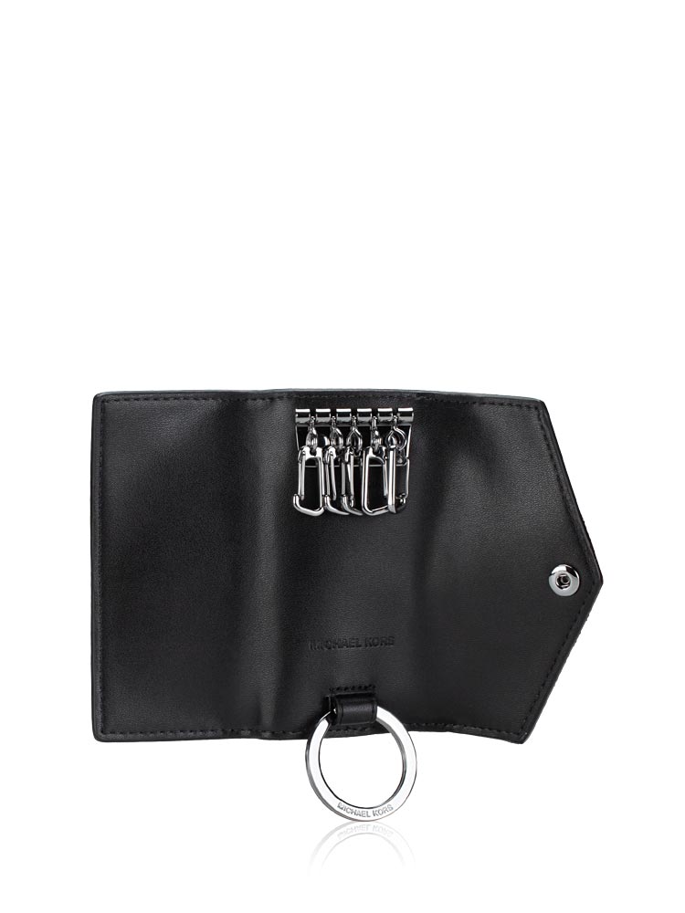 Made of saffiano leather. The key holder features a button closure that opens to smooth leather and polyester lining with five key chain, exterior one slip pocket at back.