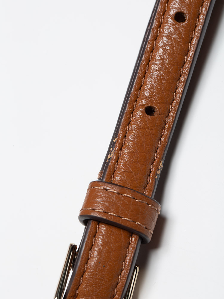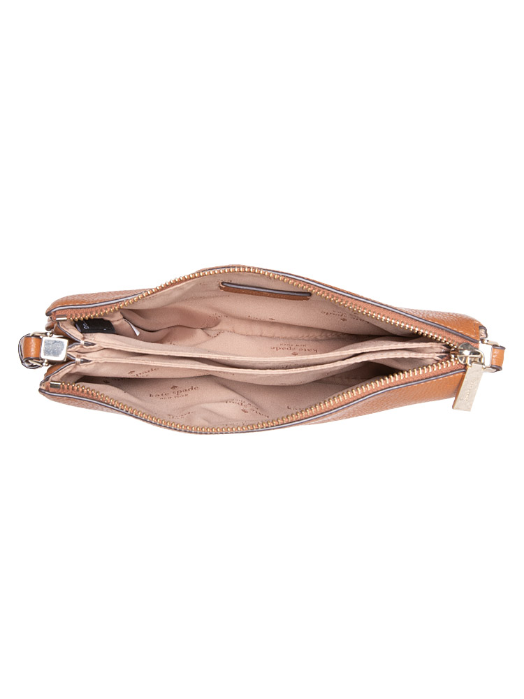 Made of pebble leather. The bag features a zip closure that opens to polyester lining with one slip pocket, two slip compartments and adjustable strap.