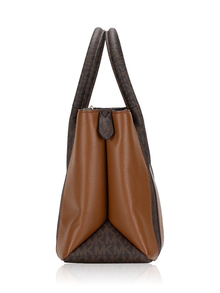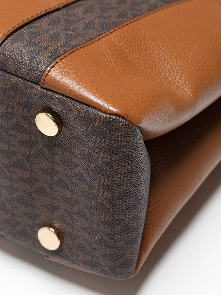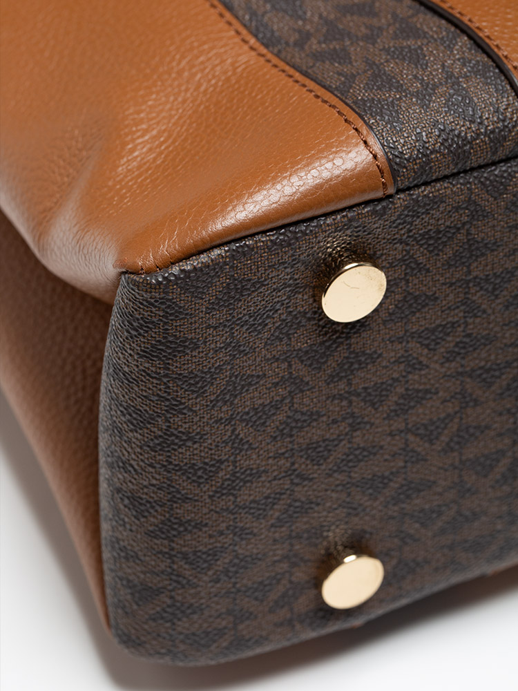Made of pebble leather and coated canvas. The bag features a magnetic closure that opens to polyester lining with middle zip pocket, one zip pocket, one slip pocket.
