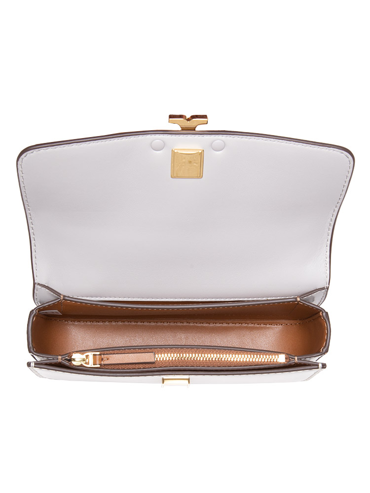 Made of calf leather with leather lining. The bag features an open magnetic flap closure, gold tone hardware, two slip pockets, adjustable and removable crossbody wear.