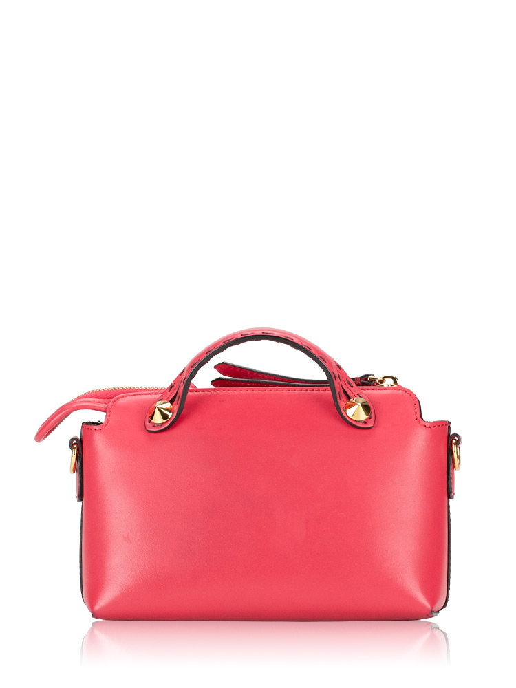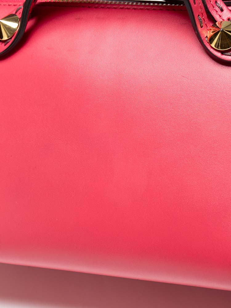 Crafted of calfskin leather. Features leather strap top handles with cone polished gold studs and an adjustable cross-body shoulder strap. There is an over-extending top zipper that opens to a fabric interior with a patch pocket.