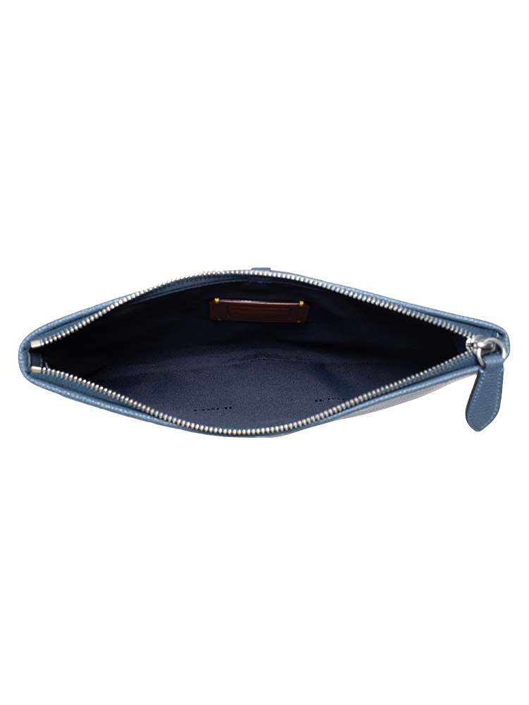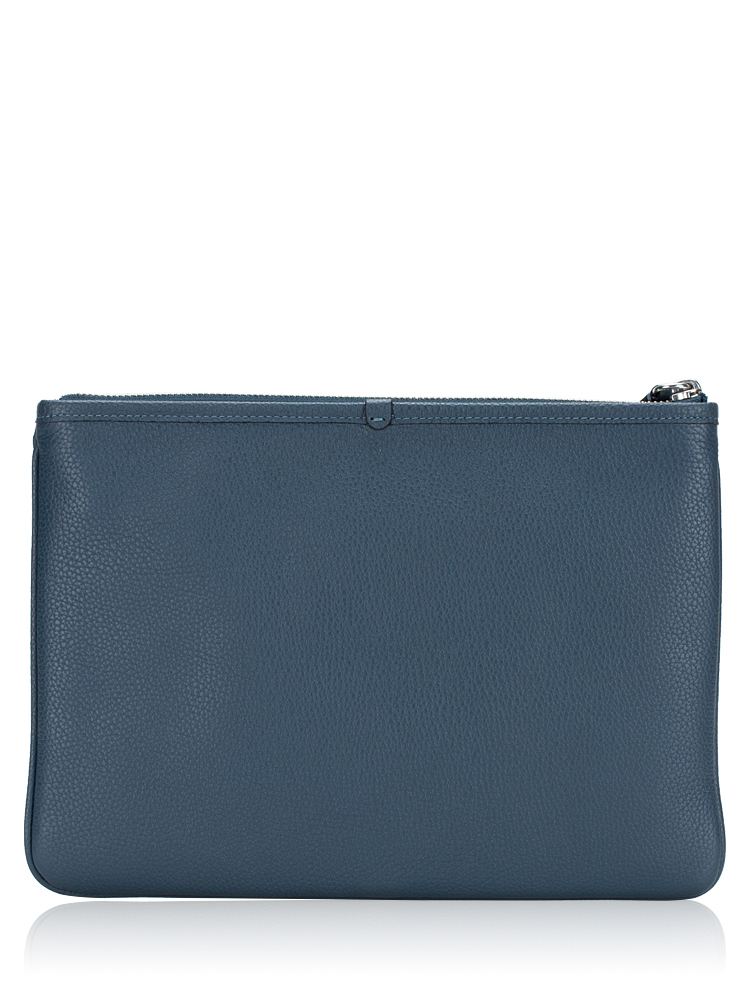 Made of pebbled leather. The pouch features a zip closure that opens to Fabric Lining with room for an iPad and more.