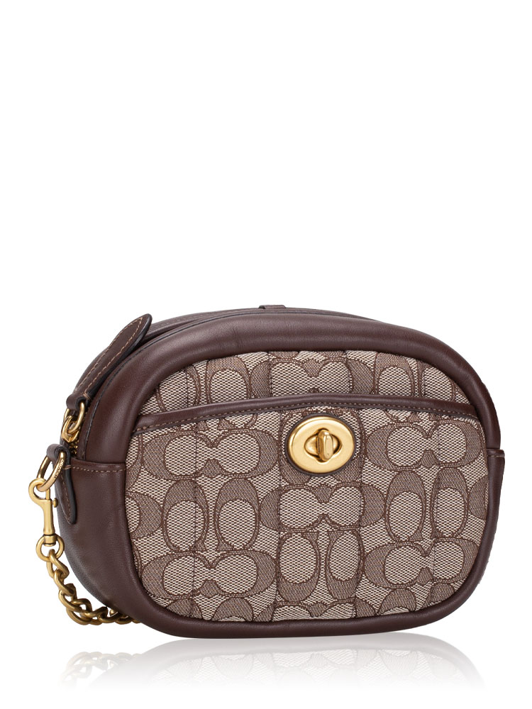 Crafted of signature jacquard and glovetanned leather. It features a zip closure, a card slots, a slip pocket and an outside turnlock pocket. It comes an optional strap
