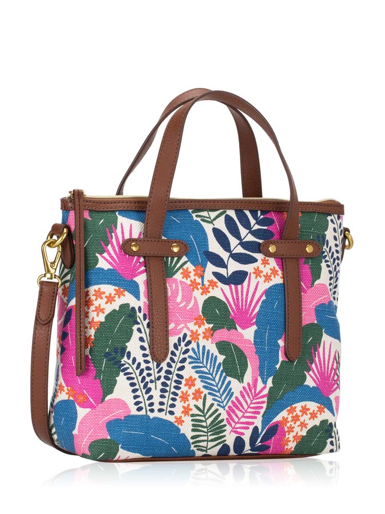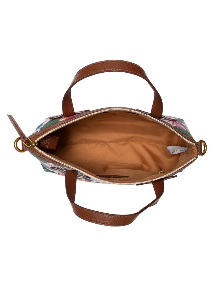 The bag is crafted of canvas and leather trim with floral design. It features double handles, a zip closure, a fabric lining with a zip wall pocket and double slip wall pockets.