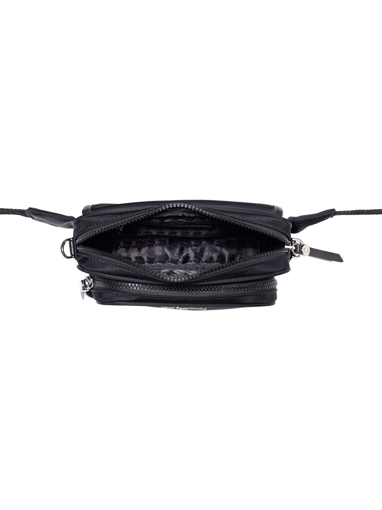 Made of nylon. The bag features a zip closure that opens to polyester lining with one zip pocket, exterior one zip compartment at front with four card slots, adjustable belt strap, adjustable and removable long strap.