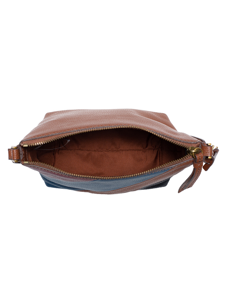 Made of leather. The bag features a zip closure that opens to polyester lining with interior one zip pocket, strap drop 19 cm.