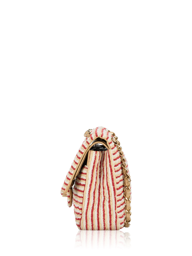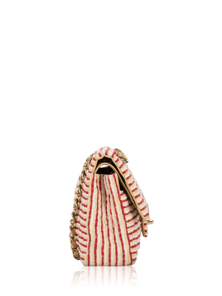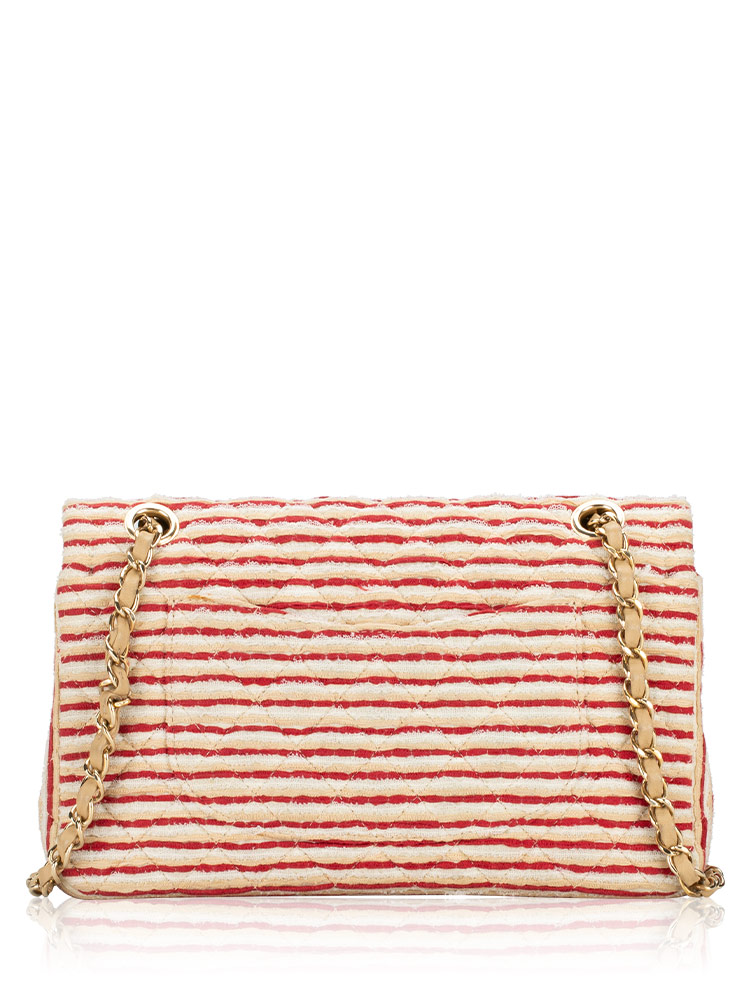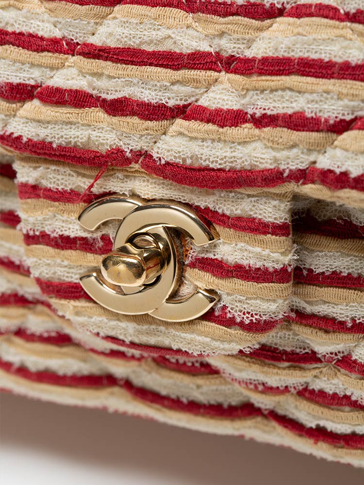 Crafted of striped jersey fabric. The bag features a waist-length gold chain leather threaded shoulder strap and a chain lined and a light gold Chanel CC Mademoiselle turn lock for the facing flap pocket.