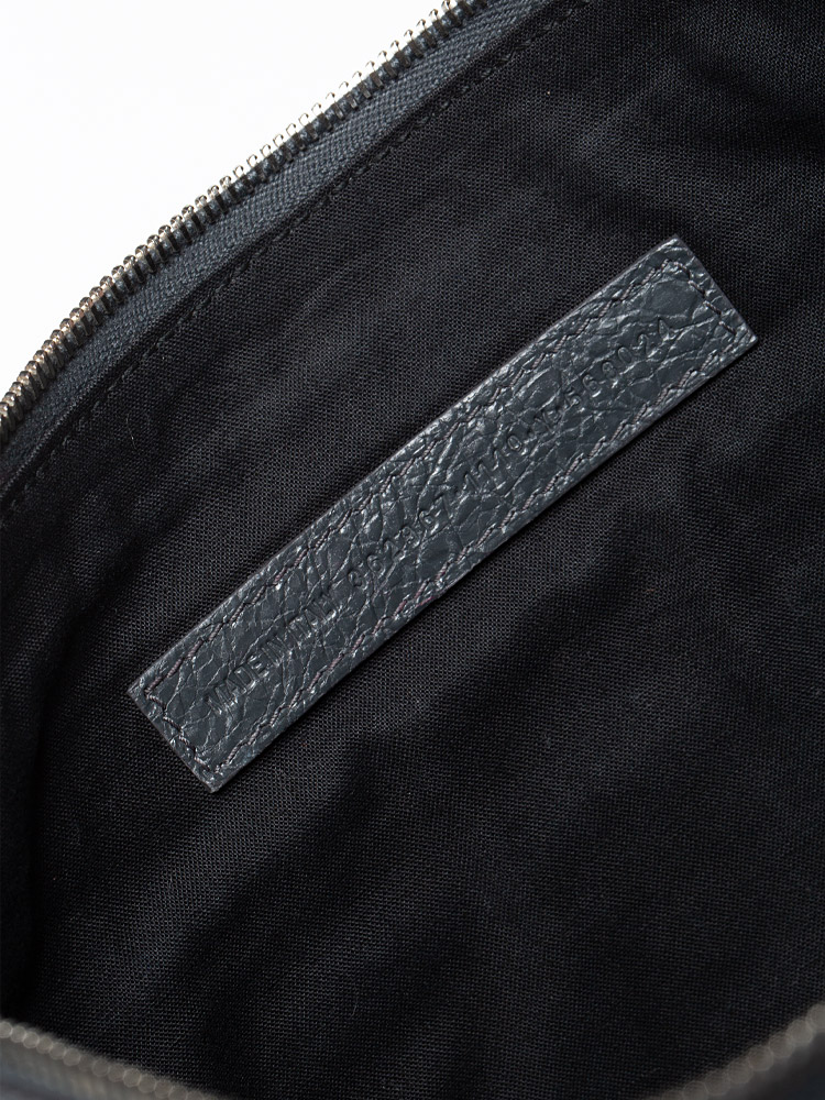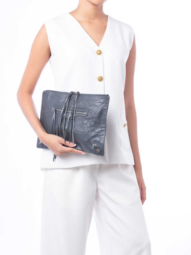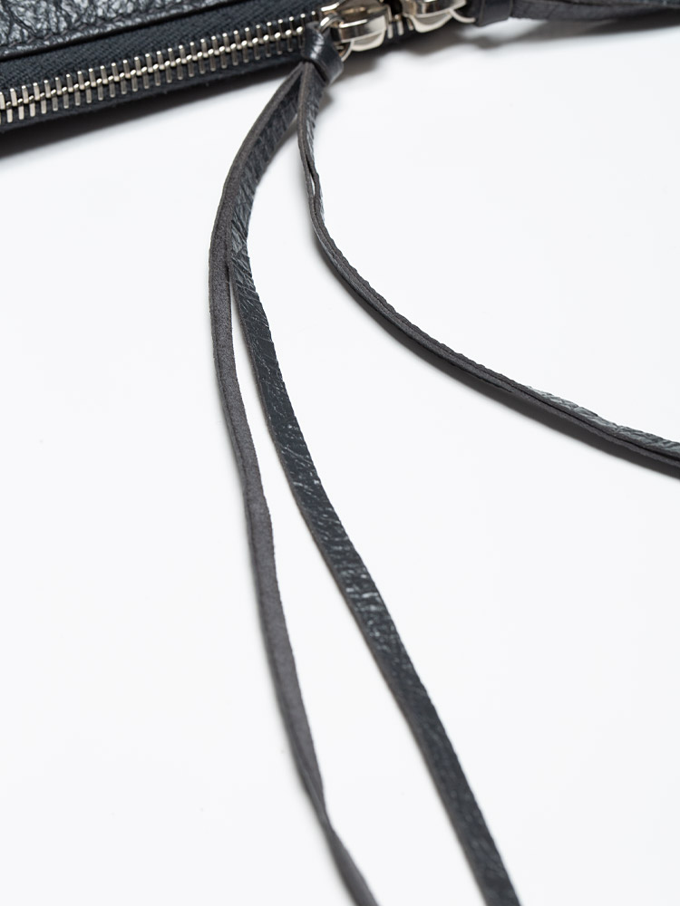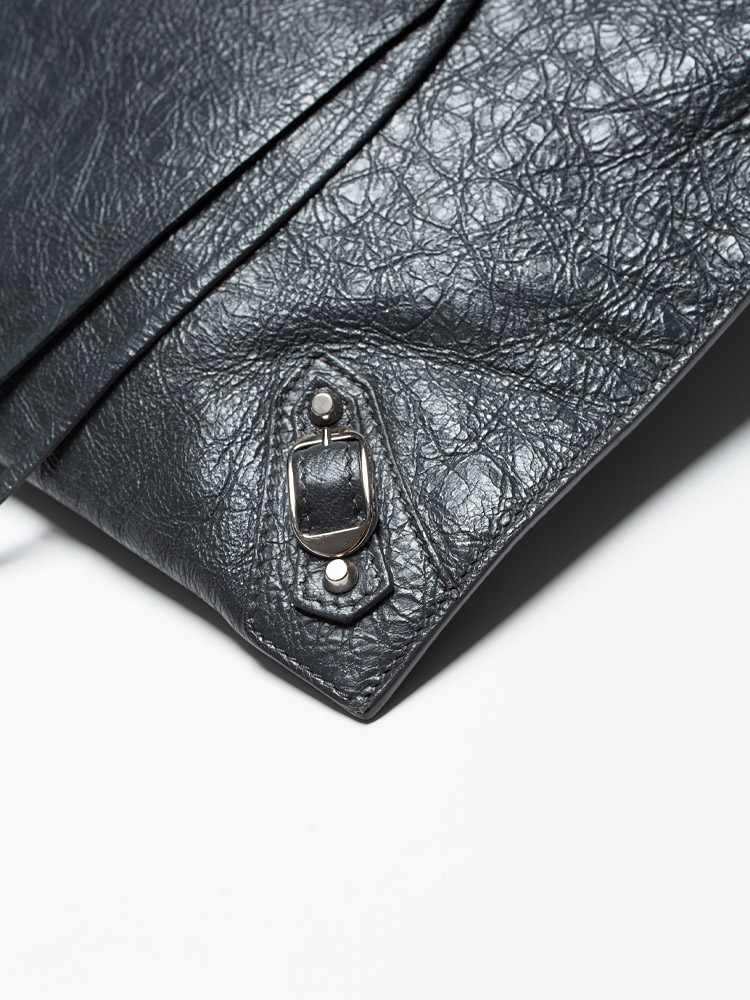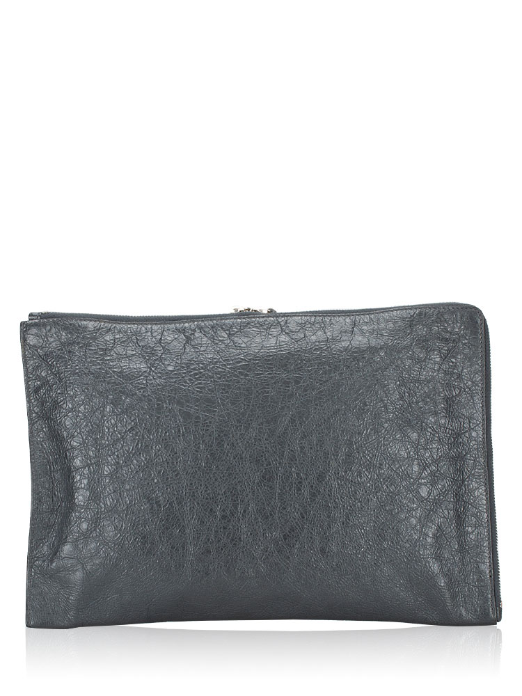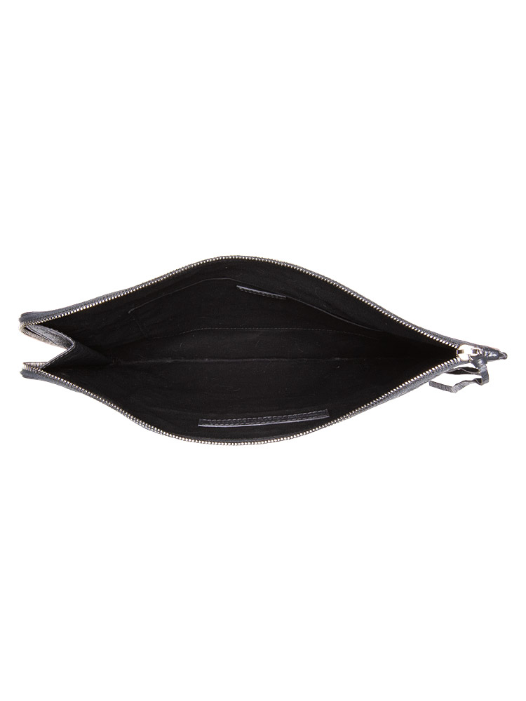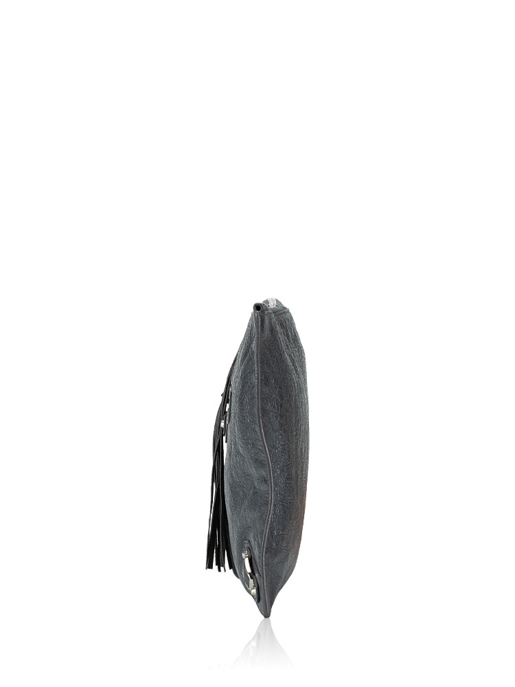 Crafted of distressed lambskin leather. This clutch features a facing zipper pocket, a leather zipper pull tassel, leather patches and belts, silver hardware buckles and decorative studs. The top zipper opens to a fabric interior.