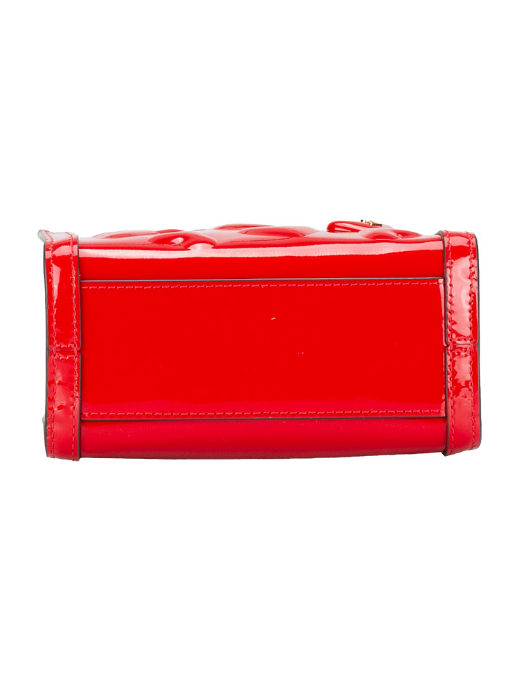 Made of patent leather. The bag features a magnetic closure that opens to two way script logo lining with interior one slip pocket.