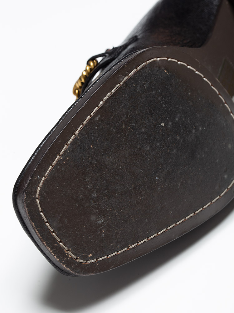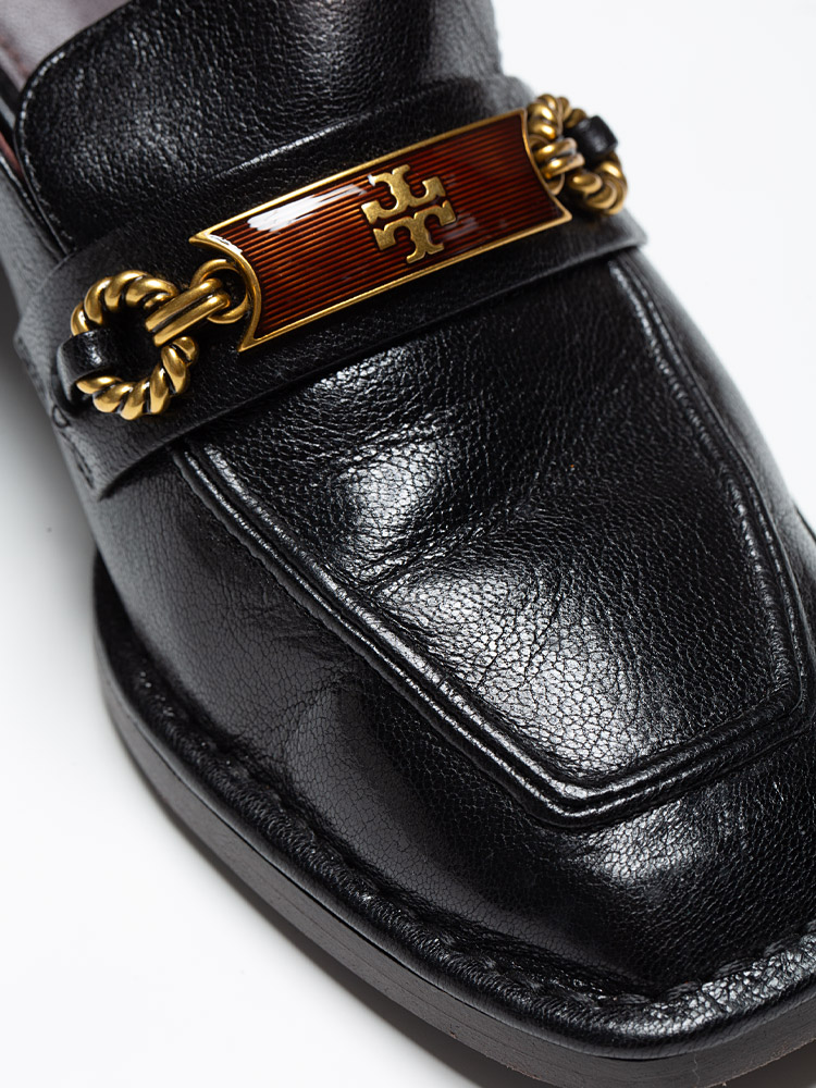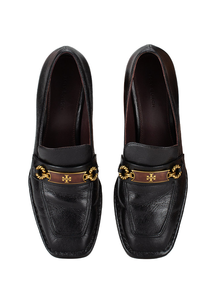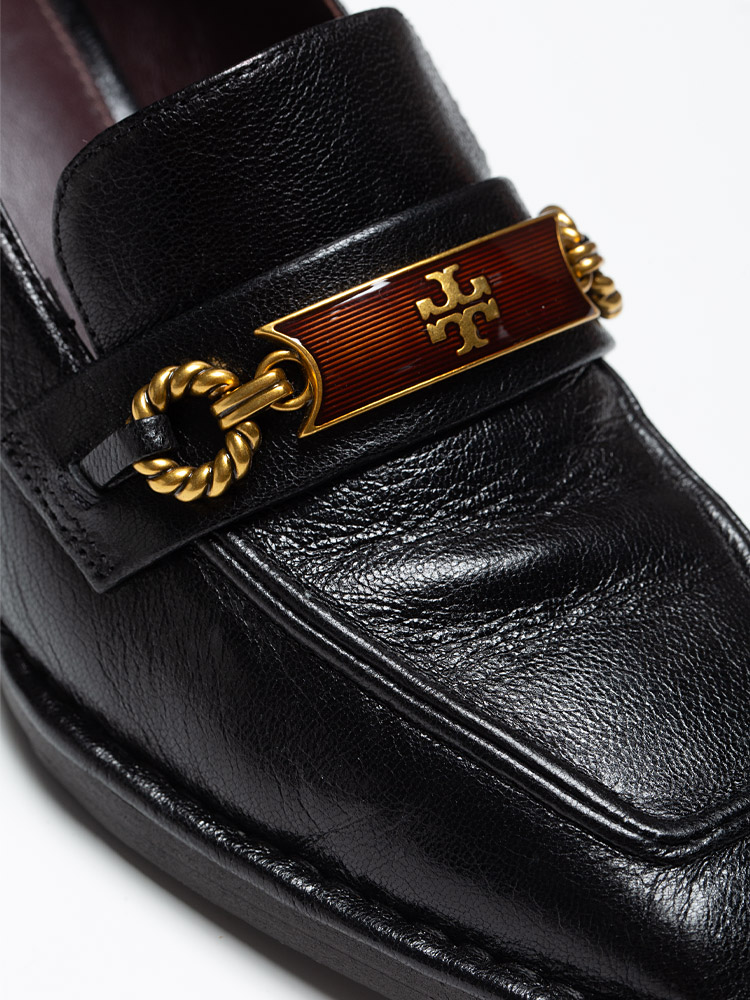 The Perrine Loafer is a masculine silhouette shaped by feminine details. Its vintage mood is underscored by a flared heel and signature hardware, an enamel Double T plate with braided brass rings.