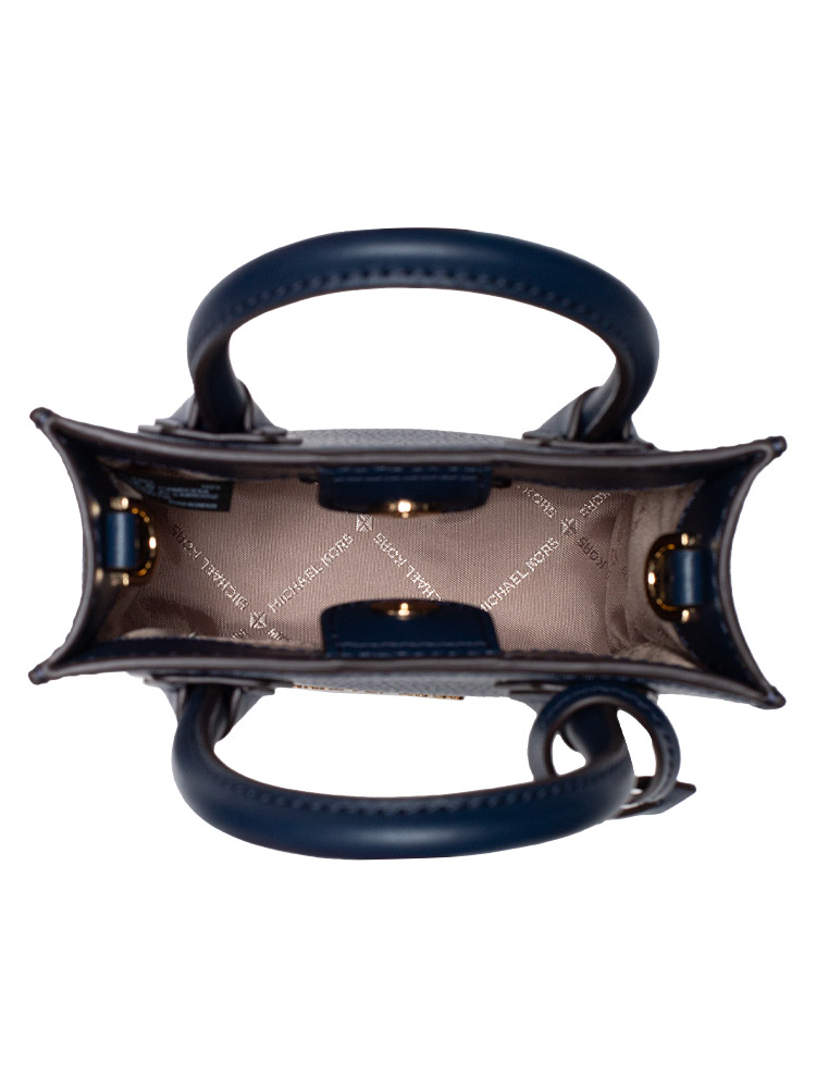 Made of pebble leather. The bag features a open with magnetic closure that opens to polyester lining with three card slots, double handles drop 11 cm.