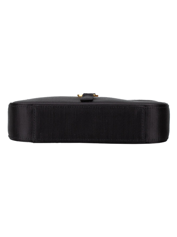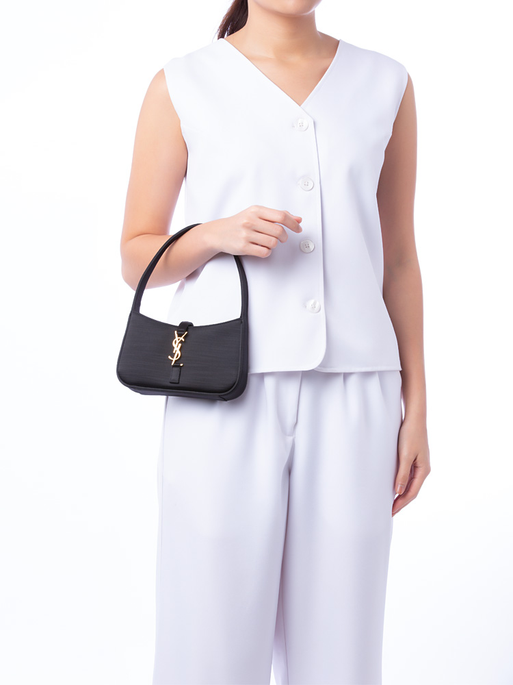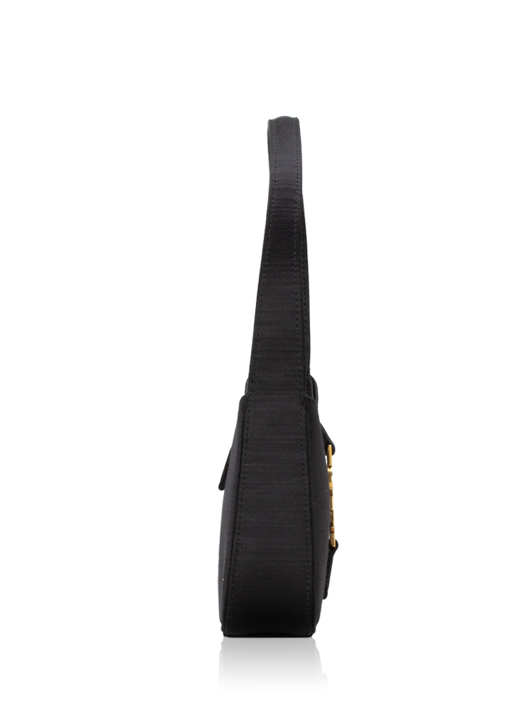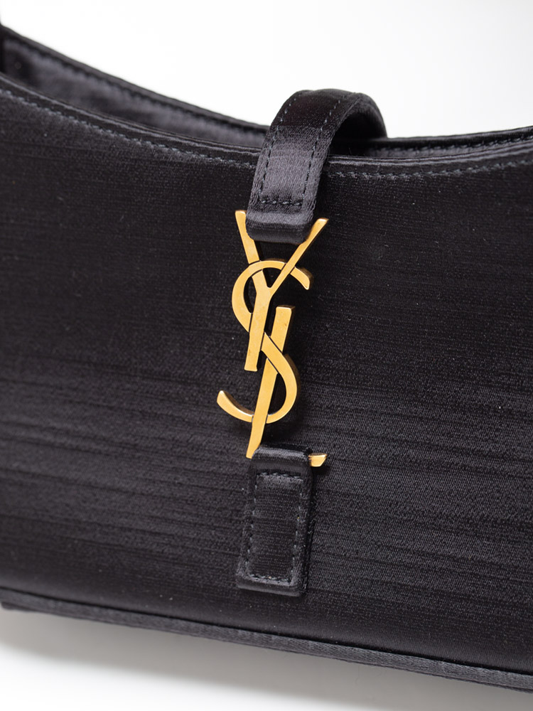 Crafted of satin fabric . The front features a gold prominent YSL monogram crossover strap that opens to a leather interior.
