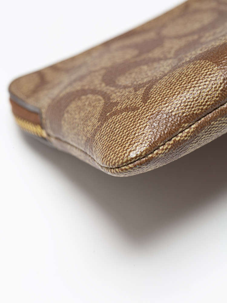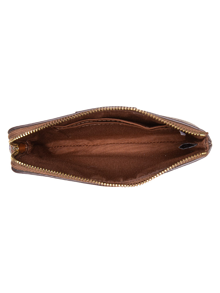 Crafted of signature coated canvas and stripe smooth leather at front. A zipper opens to matching fabric lining with multiple card slots inside.