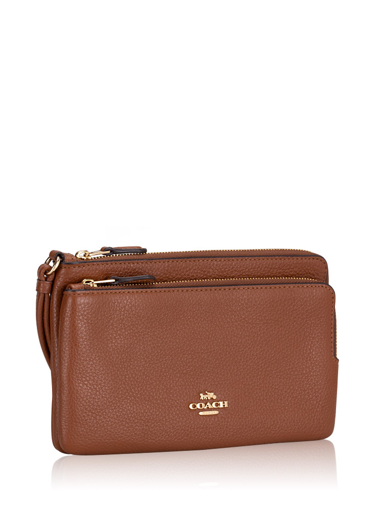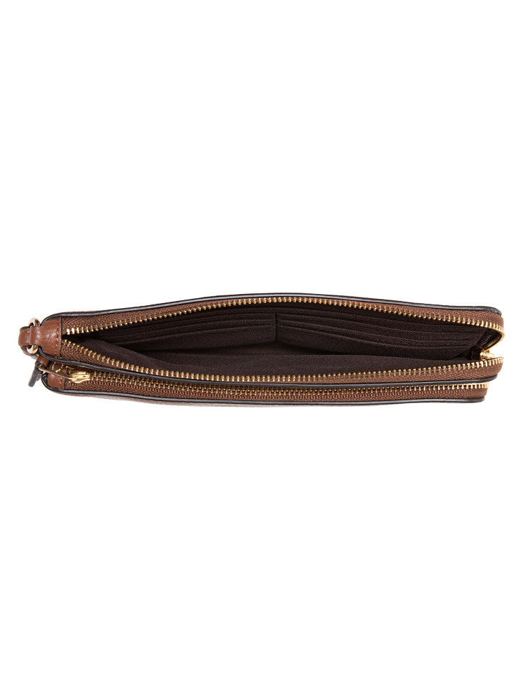 Crafted from refined pebble leather. The wallet features a zip closure that opens to fabric lining with interior six credit card slots. Full-length bill compartment. Inside open pockets. Wrist strap attached