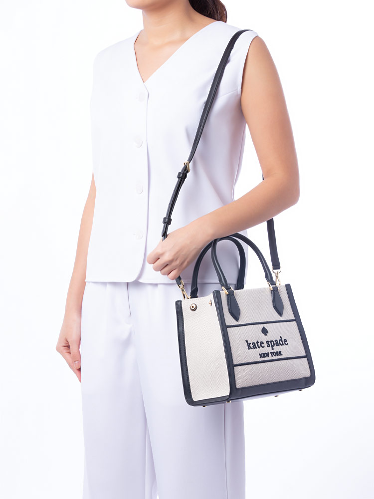 Made of canvas and smooth leather. The bag features a magnetic closure that opens to two way script logo lining with interior one zip pocket.