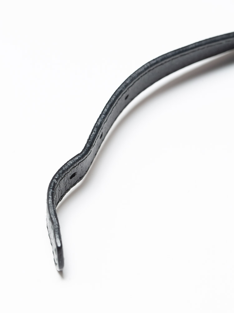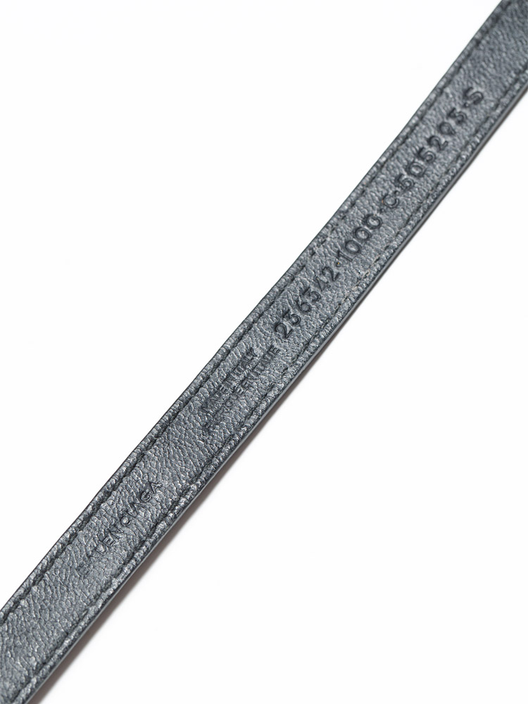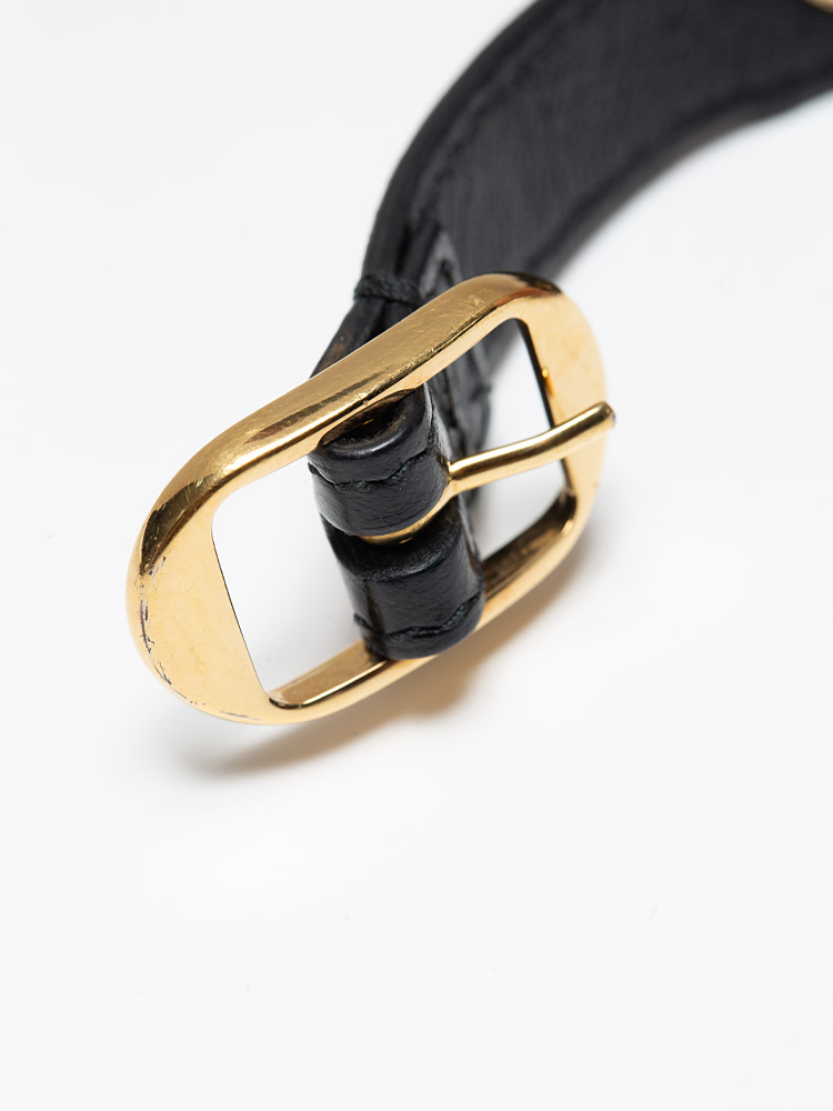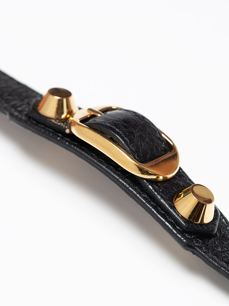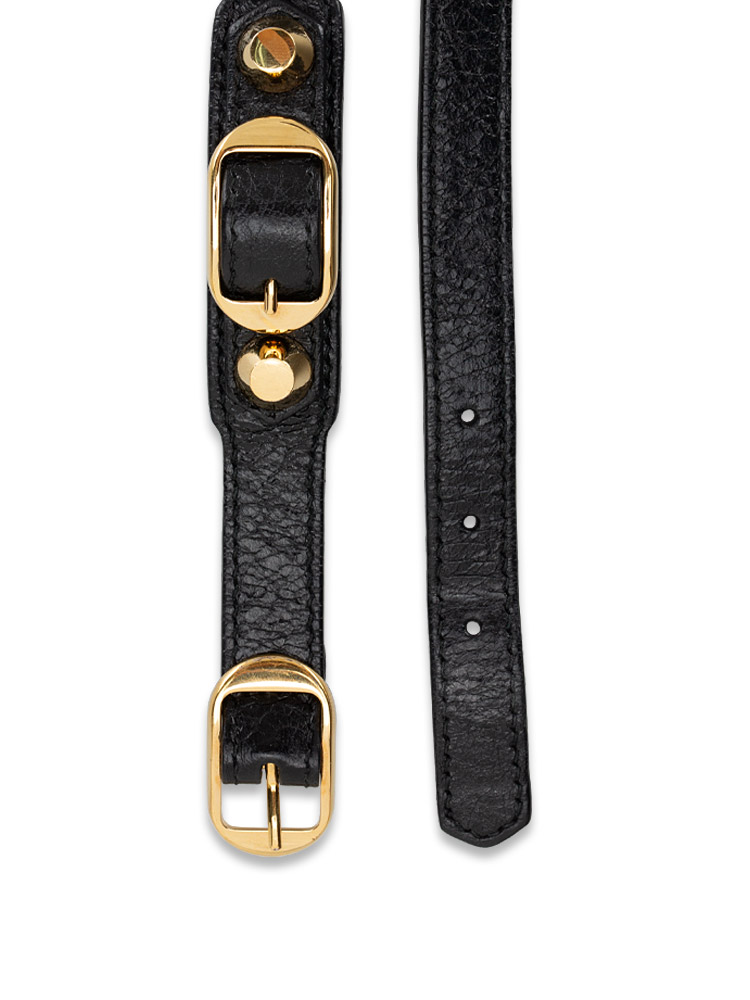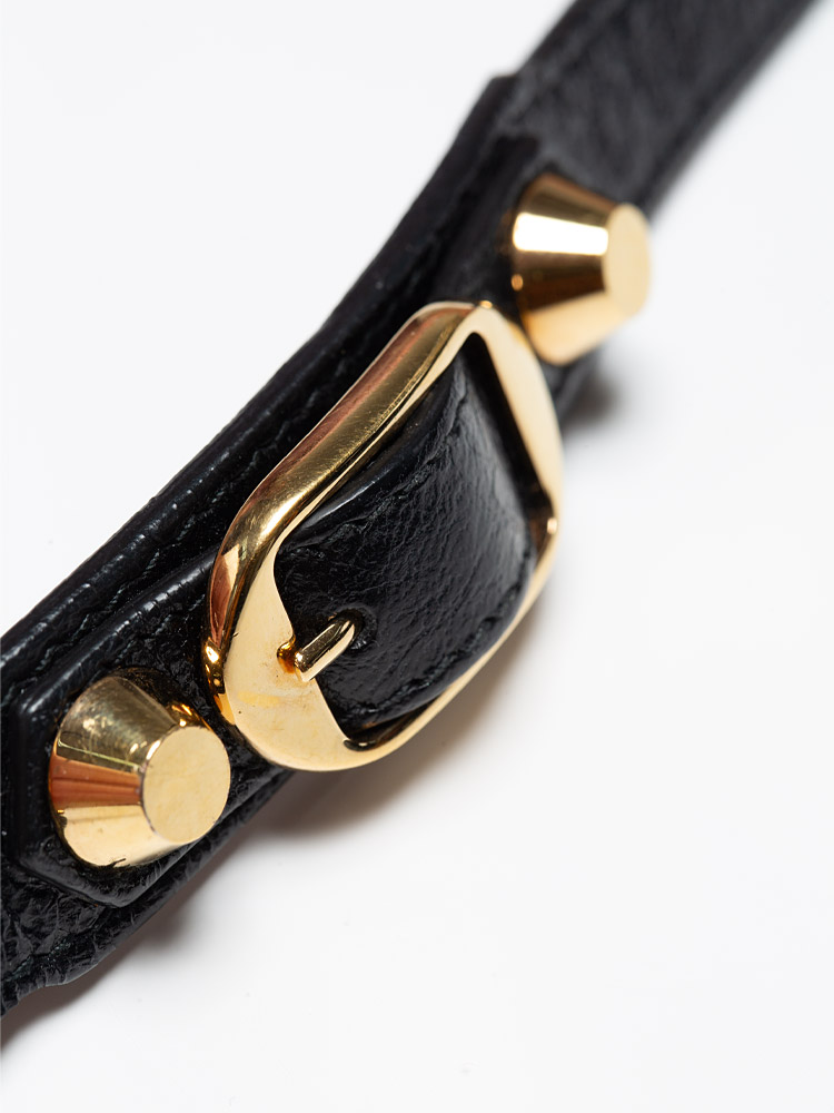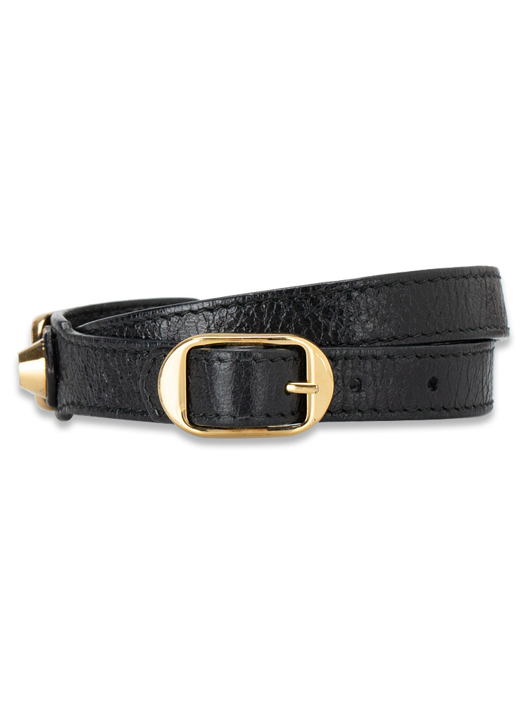 Crafted of Agneau lambskin leather in classic black and features a large brass and studs and a buckle clasp and is meant to stylishly wrap around the wrist three times.