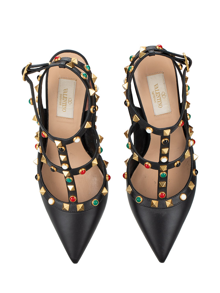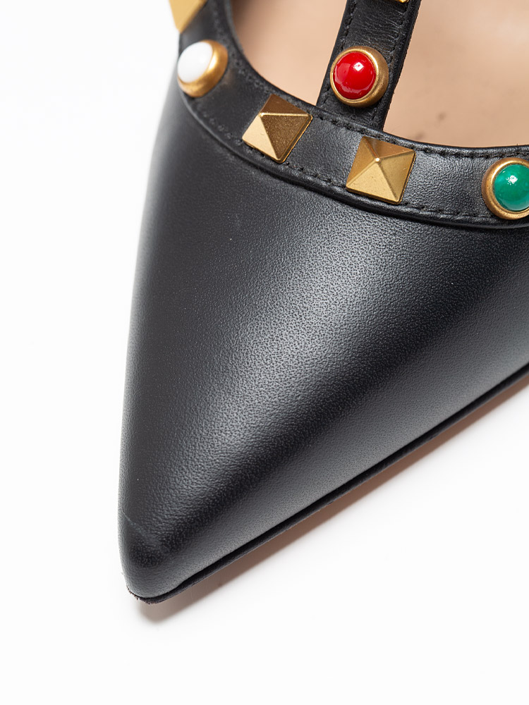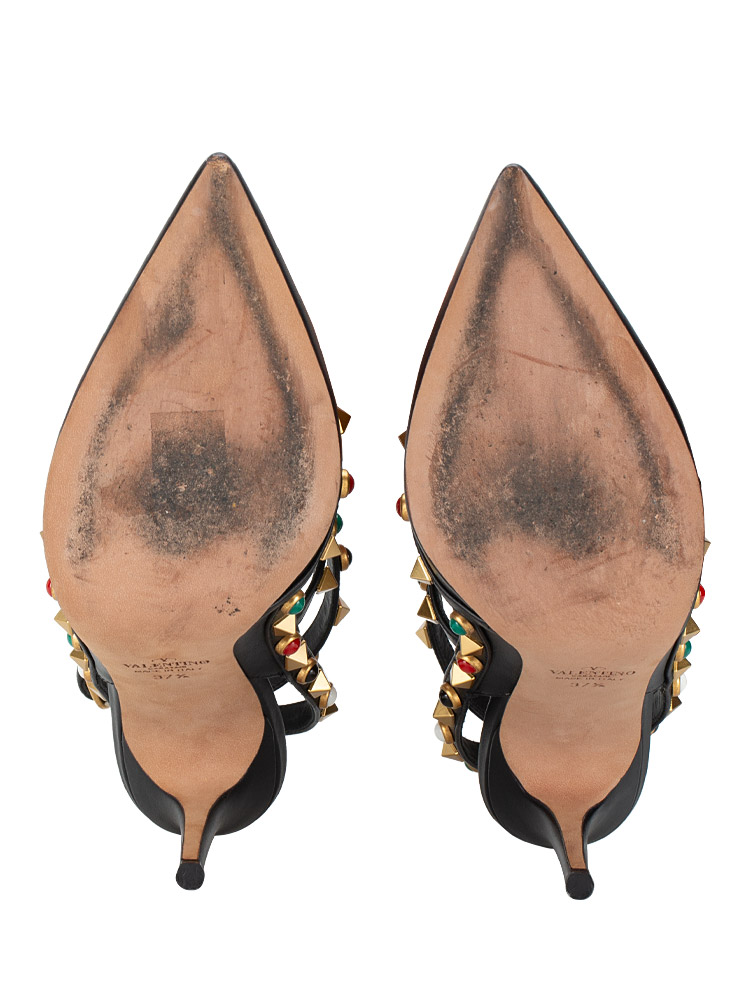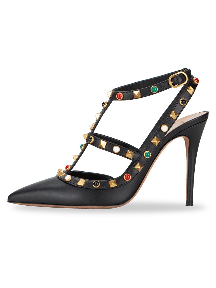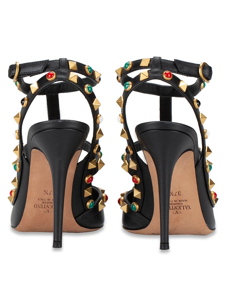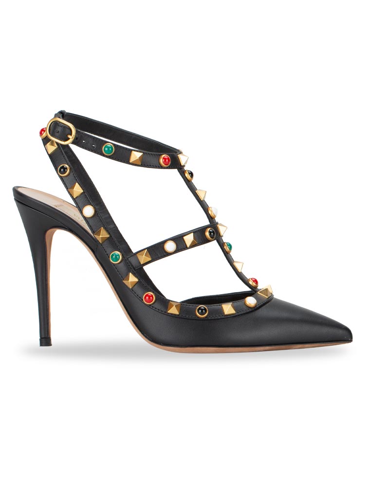 These pumps are crafted of lambskin leather in black. There is an elongated pointed toe, a 4 inch heel, and are accented with gold pyramid studs and polished multicolor round studs.