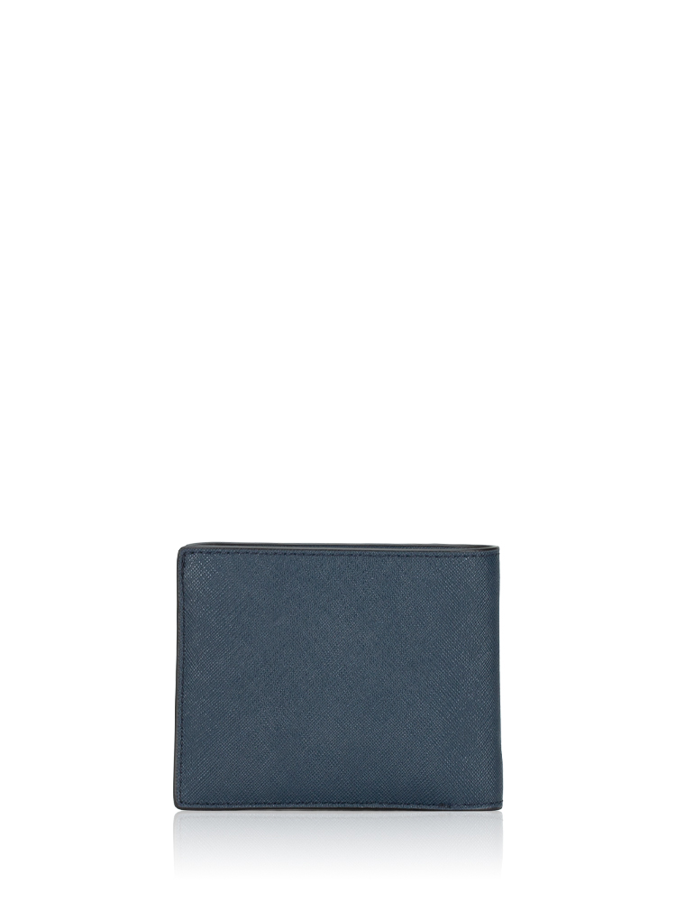 Made of saffiano leather. It features with interior two bill full length compartments, two slip pockets, eight card slots and removable id window, one slip pocket, two card slots