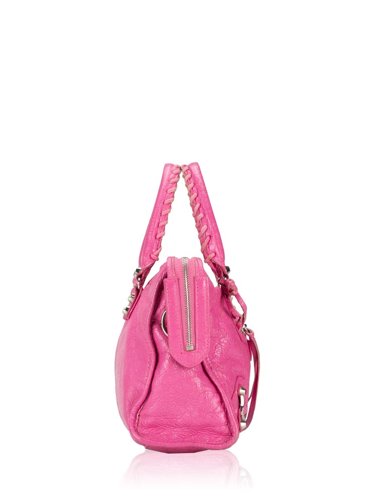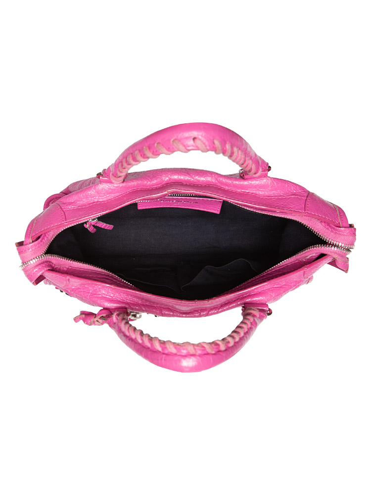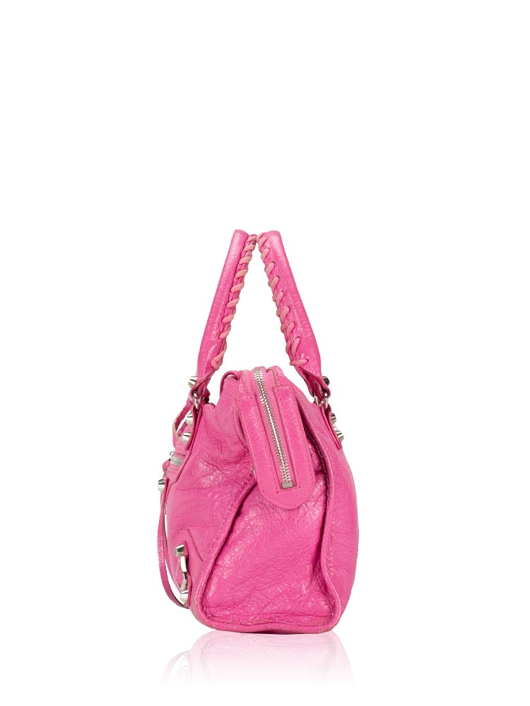 Crafted of agneau lambskin material. It features double top handles with braided stitch, an optional shoulder strap, front zipper pocket, buckles and decorative studs. The bag opens to a fabric lining with slip and zipper pockets.