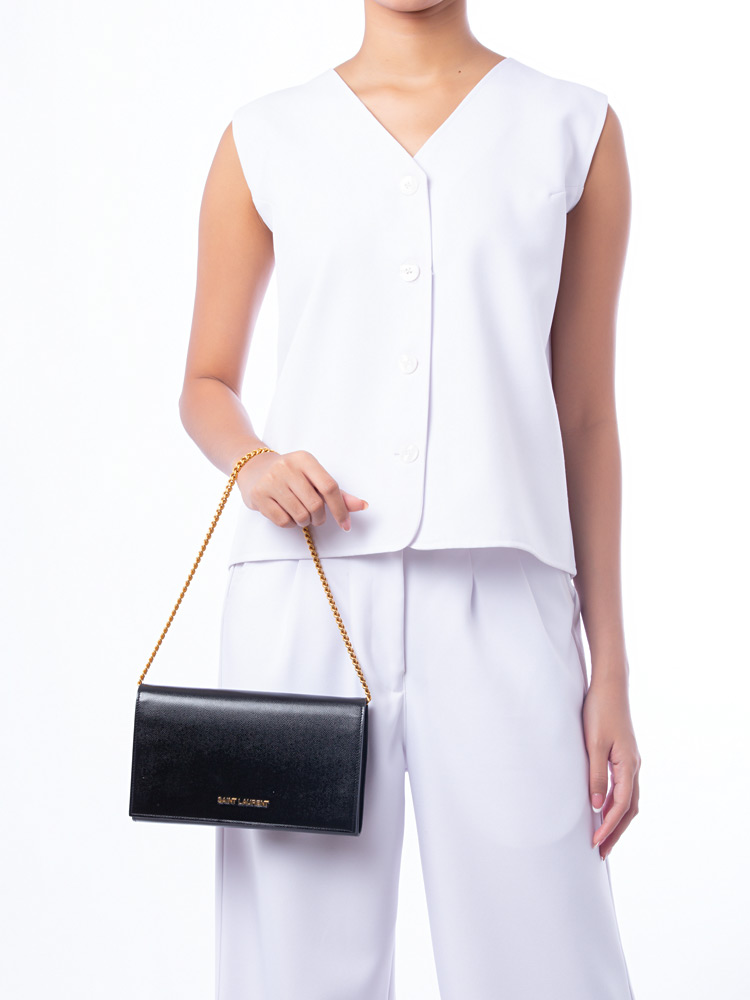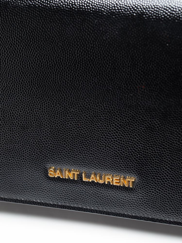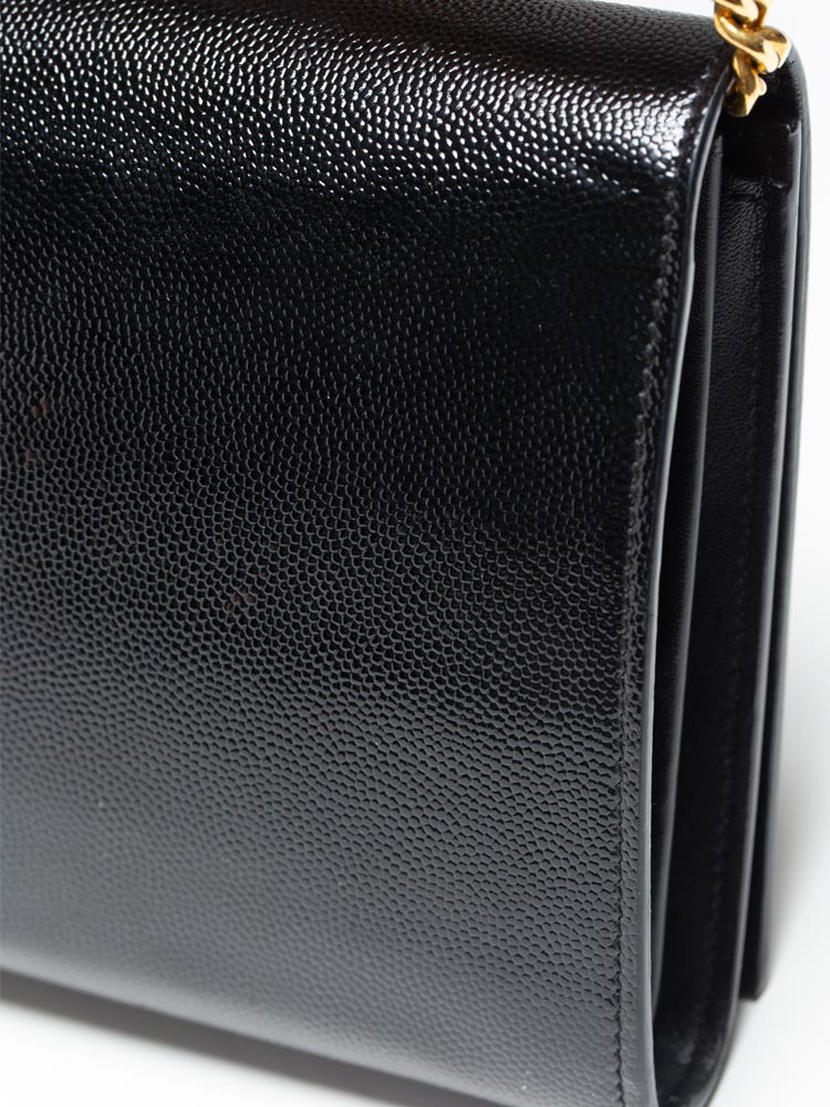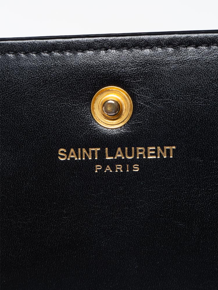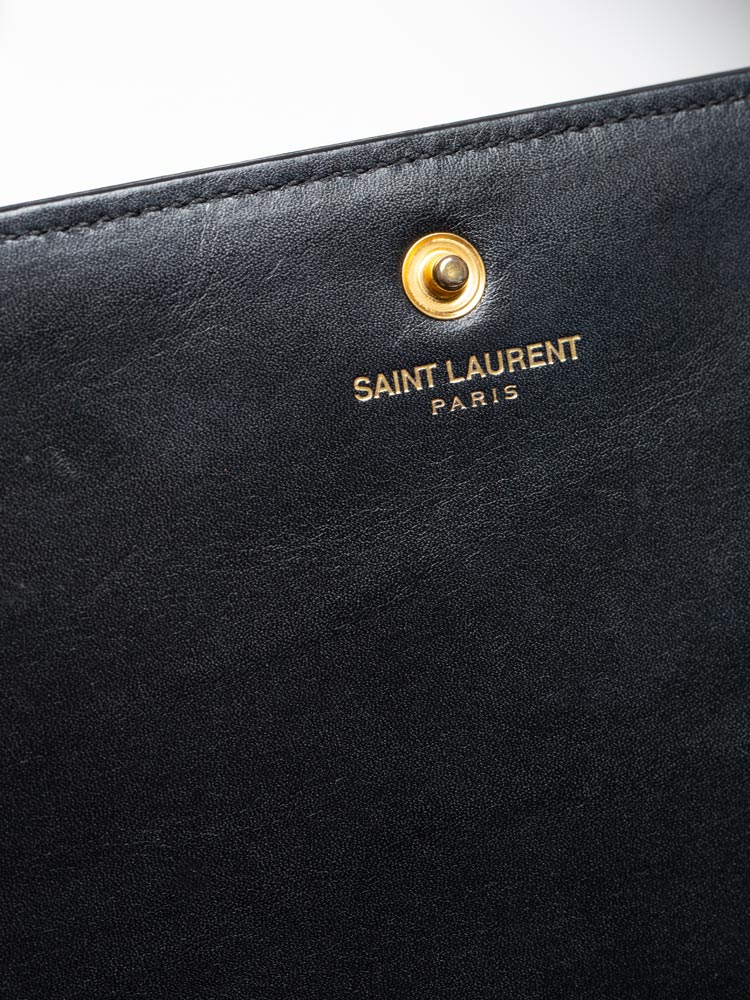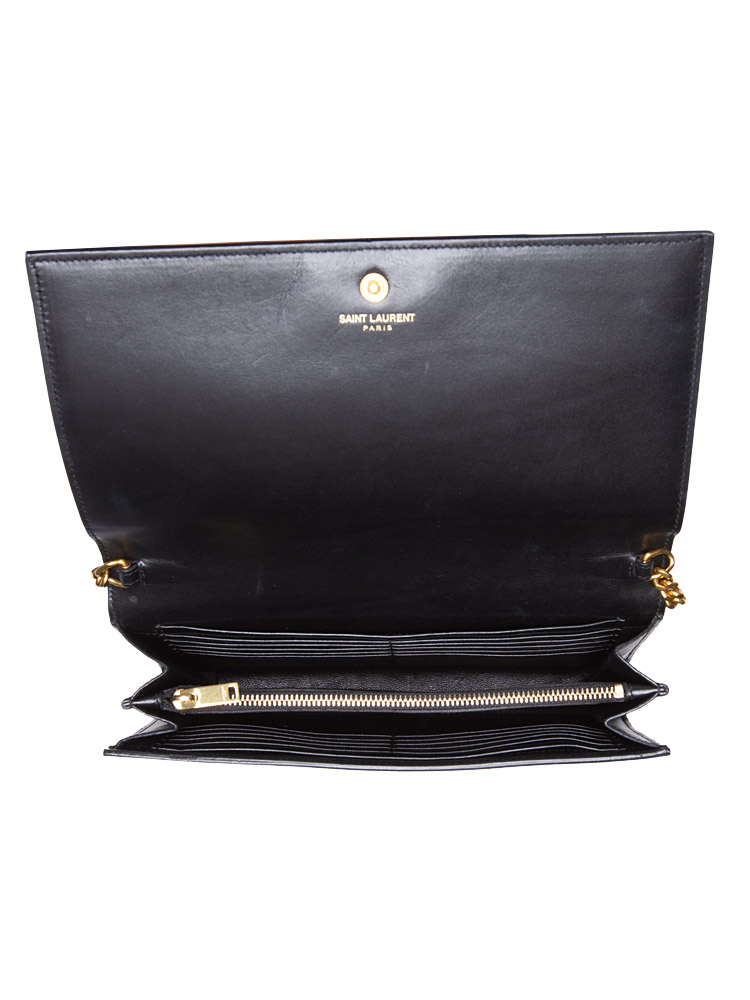 Crafted of grained calfskin leather. Features a gold chain link shoulder strap and a full facing flap with the polished gold YSL lettering. The flap opens to a leather interior with card slot panels, zippered and patch pockets.