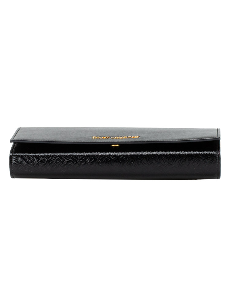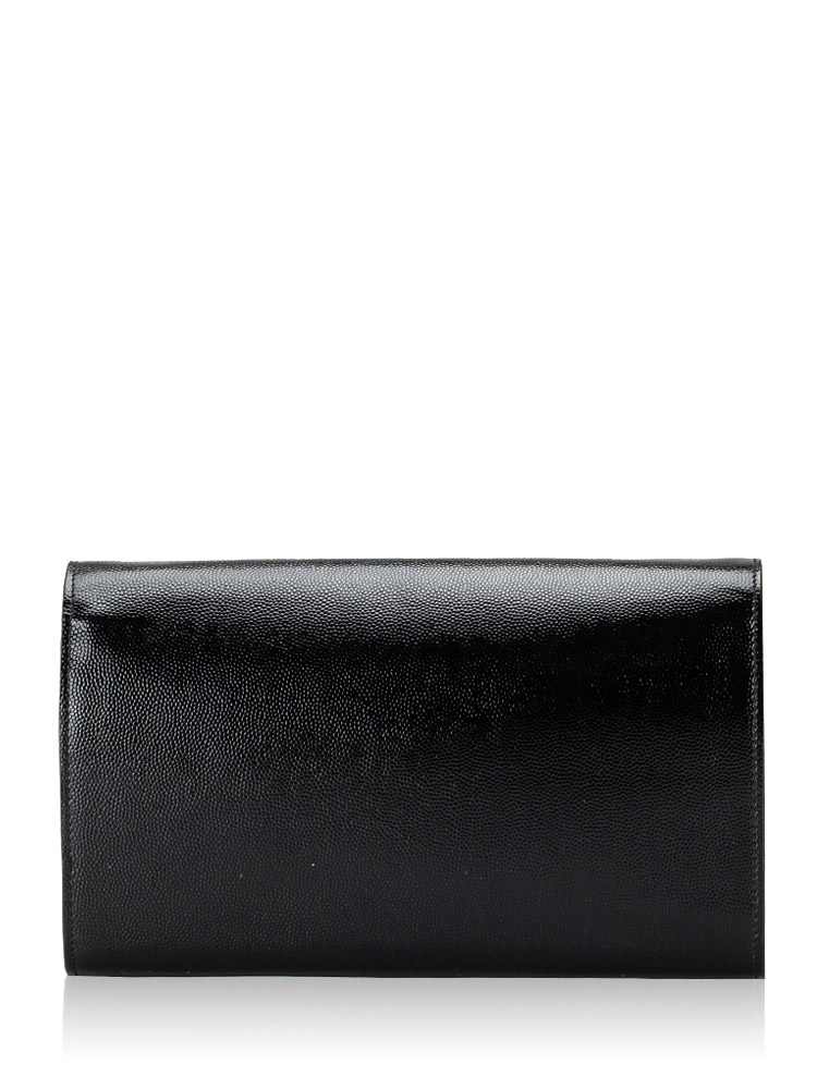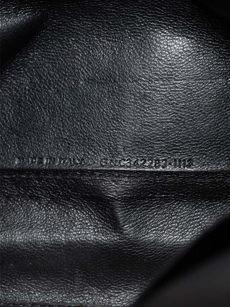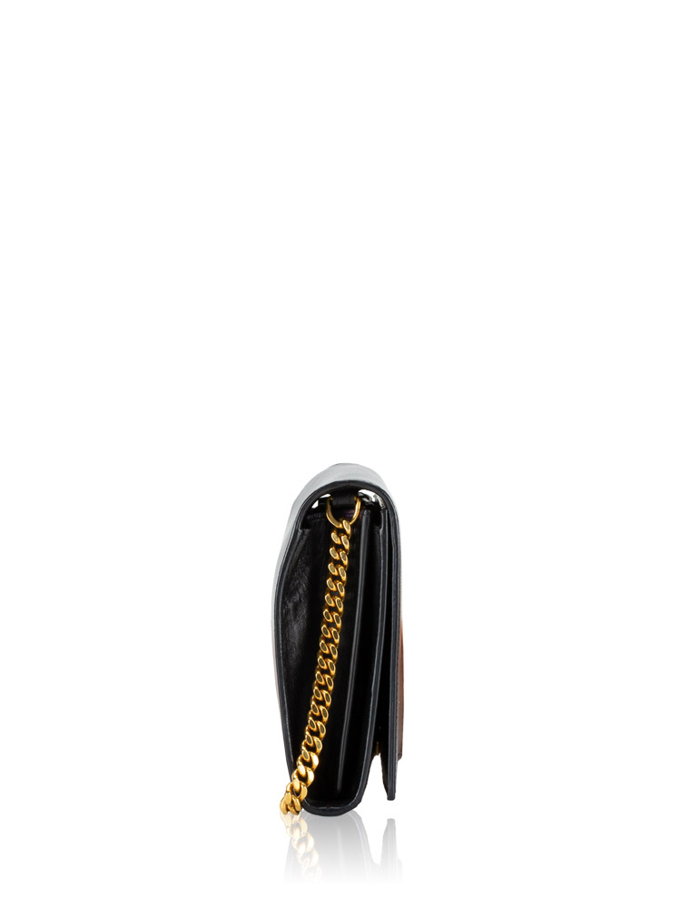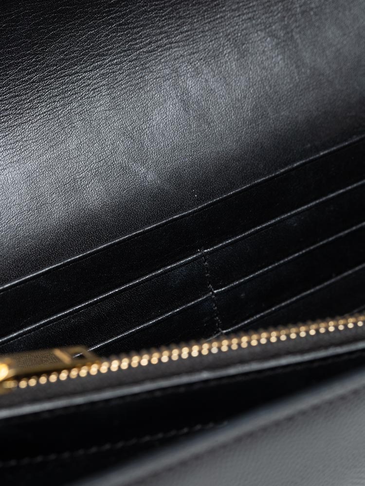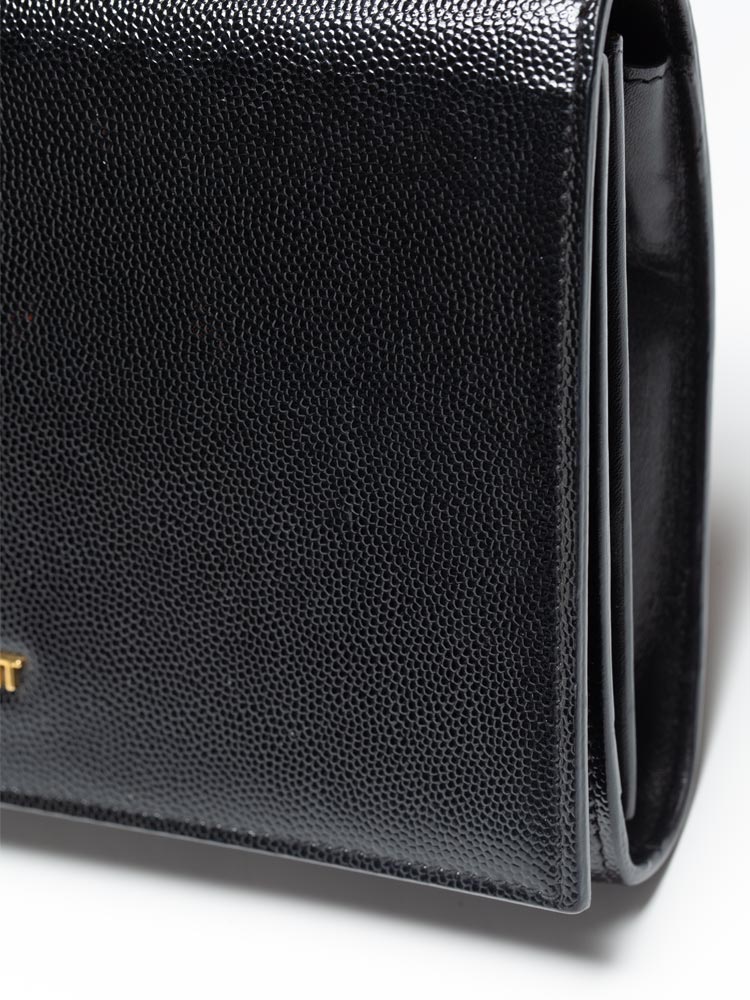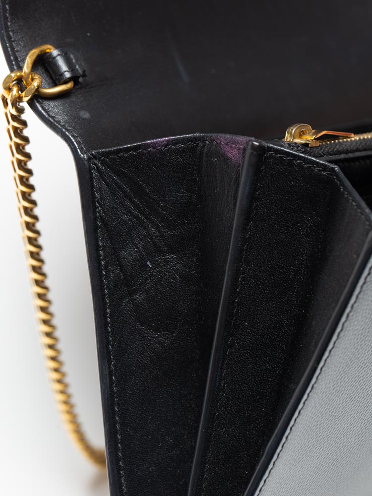 Crafted of grained calfskin leather. Features a gold chain link shoulder strap and a full facing flap with the polished gold YSL lettering. The flap opens to a leather interior with card slot panels, zippered and patch pockets.