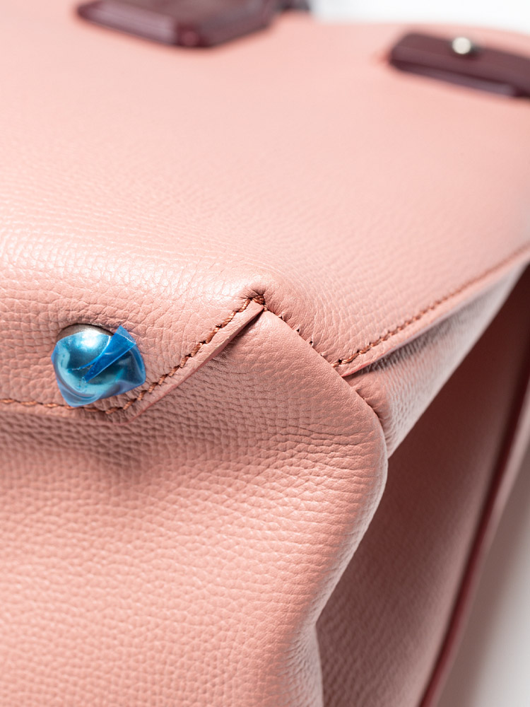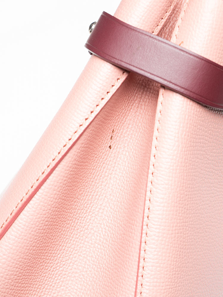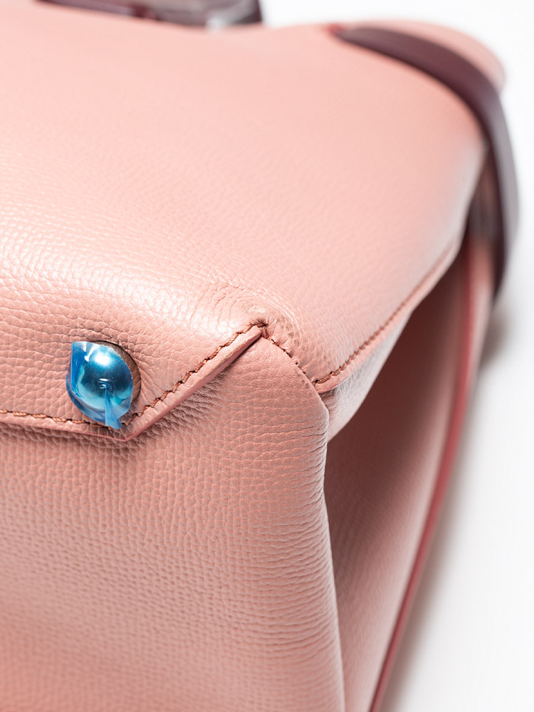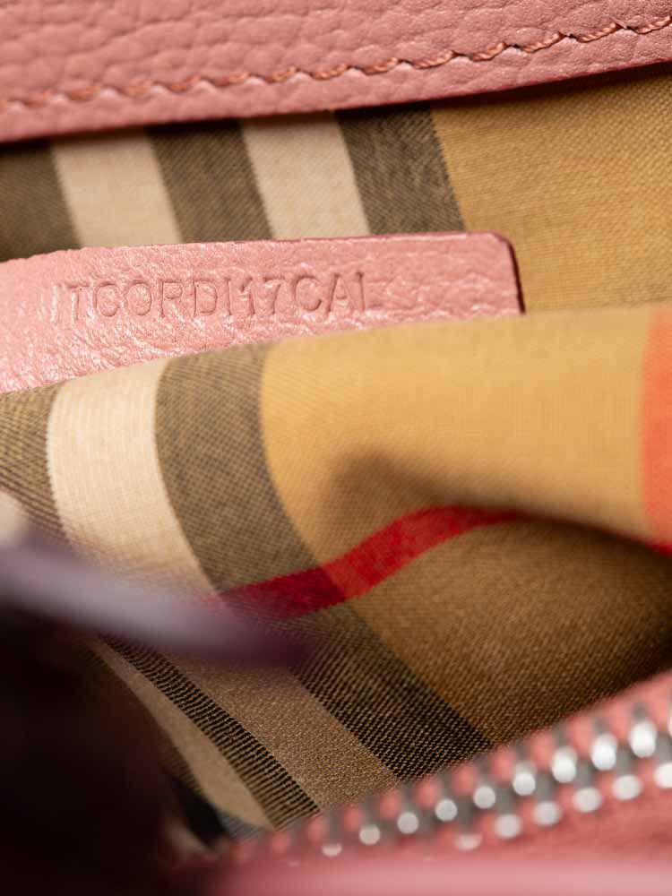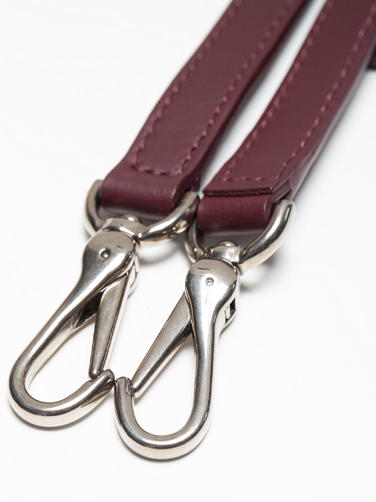 Crafted of grained calfskin leather. Features contrasting burgundy leather strap handles with side belts and an optional adjustable strap. The top opens to a house check fabric interior with zipper compartment and patch pockets.
