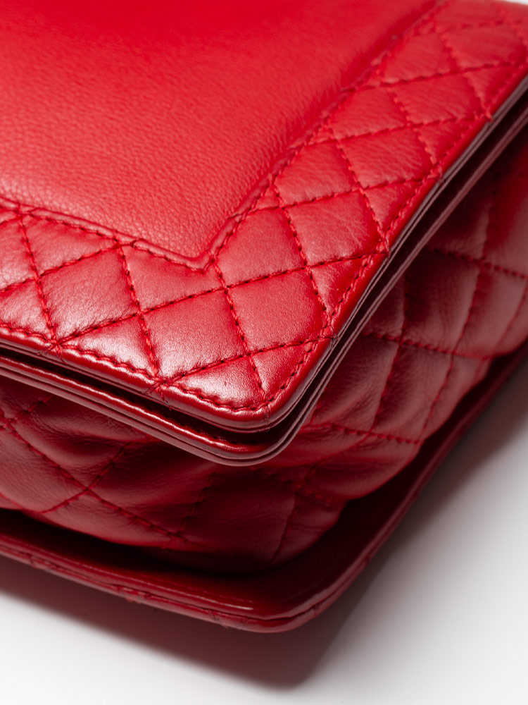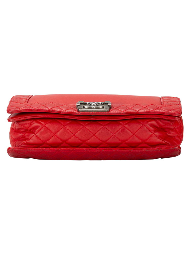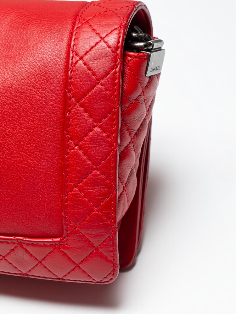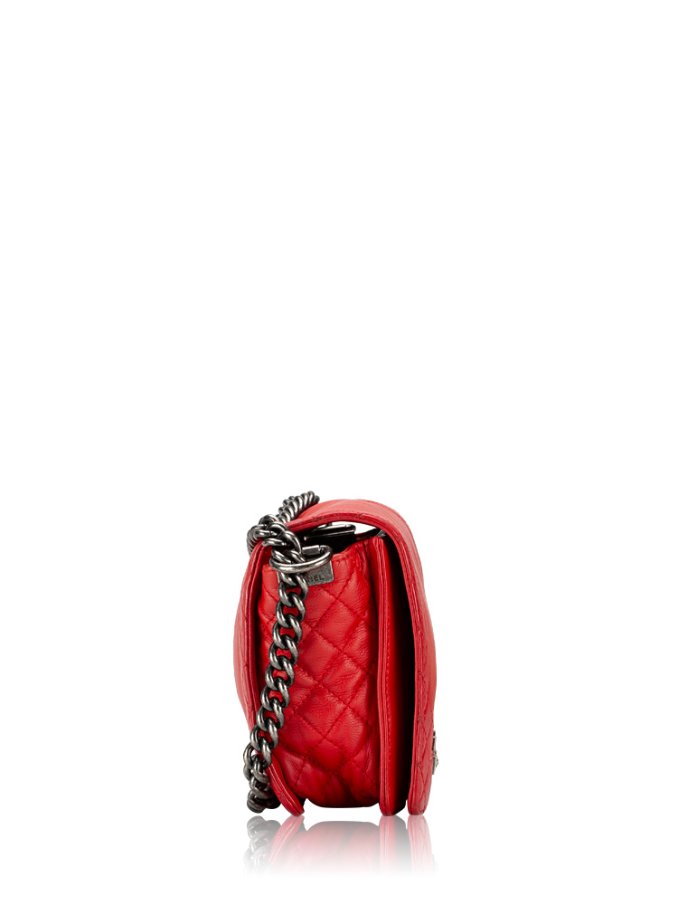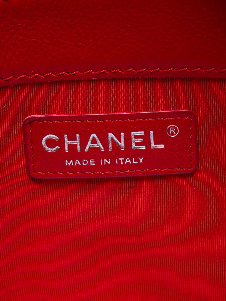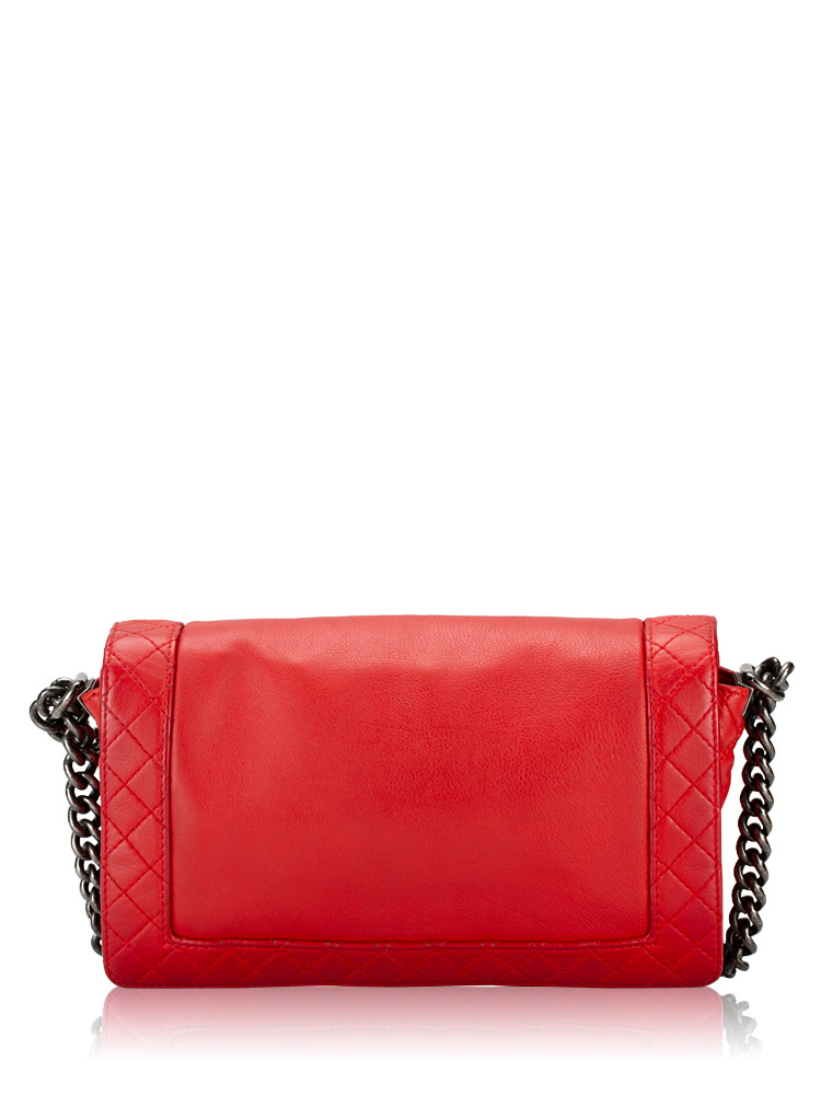 Crafted of calfskin leather and framed by diamond-quilted edges. It features a ruthenium chain strap with a leather shoulder pad and a flap with a ruthenium CC boy push lock. The flap opens to fabric interior with zipper and patch pockets.