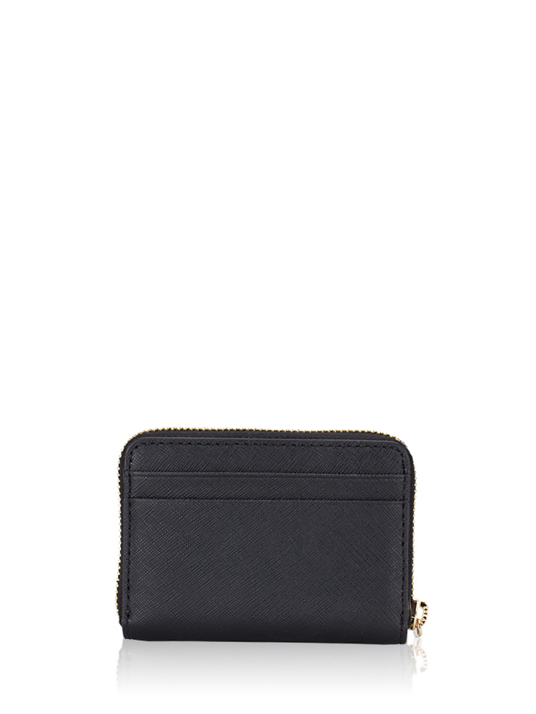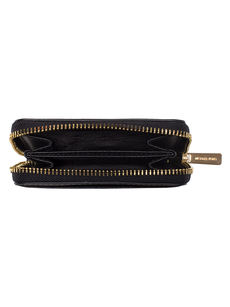 Created of saffiano leather, this card case features a zip around closure that opens to double medium compartments with a middle slip pocket and 4 card slots. It has other exterior card slots.