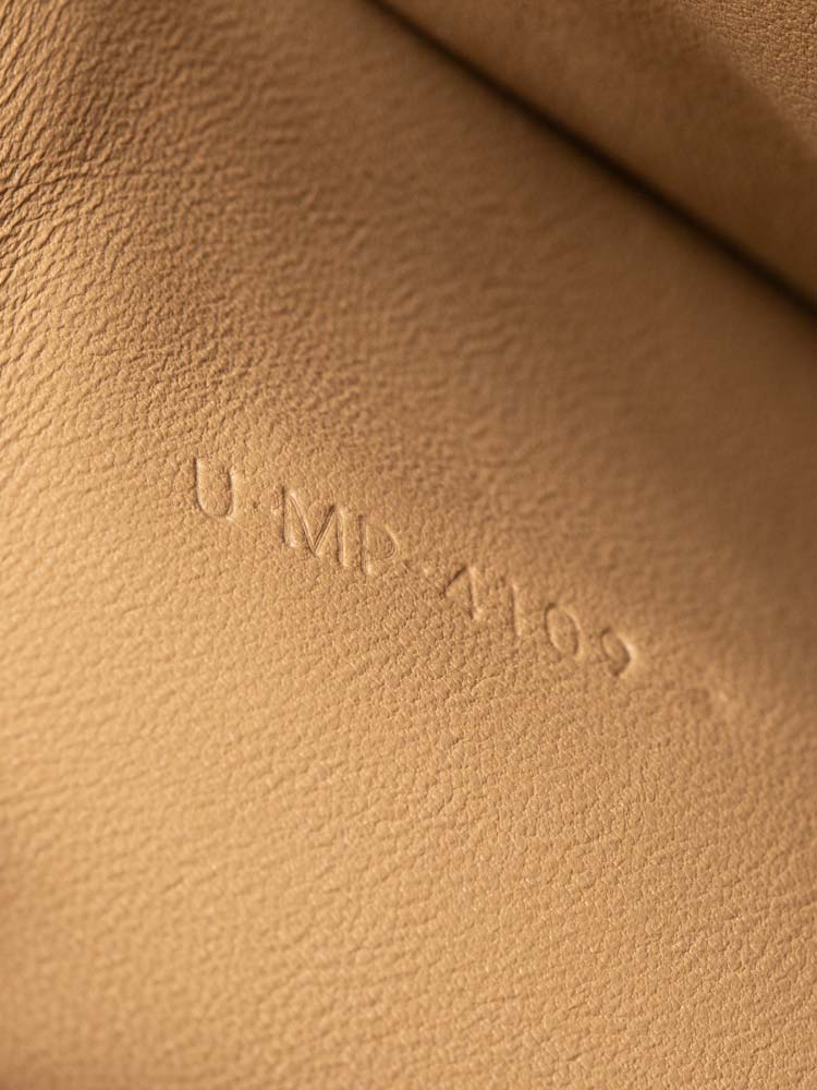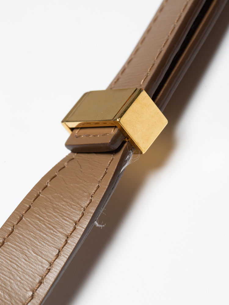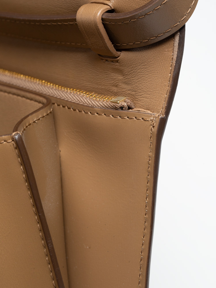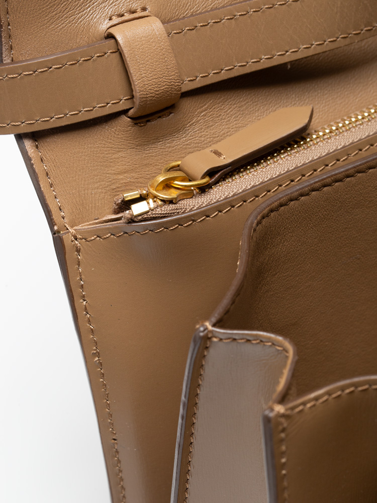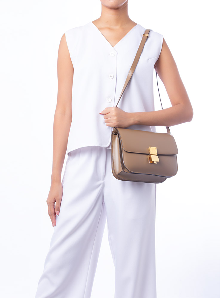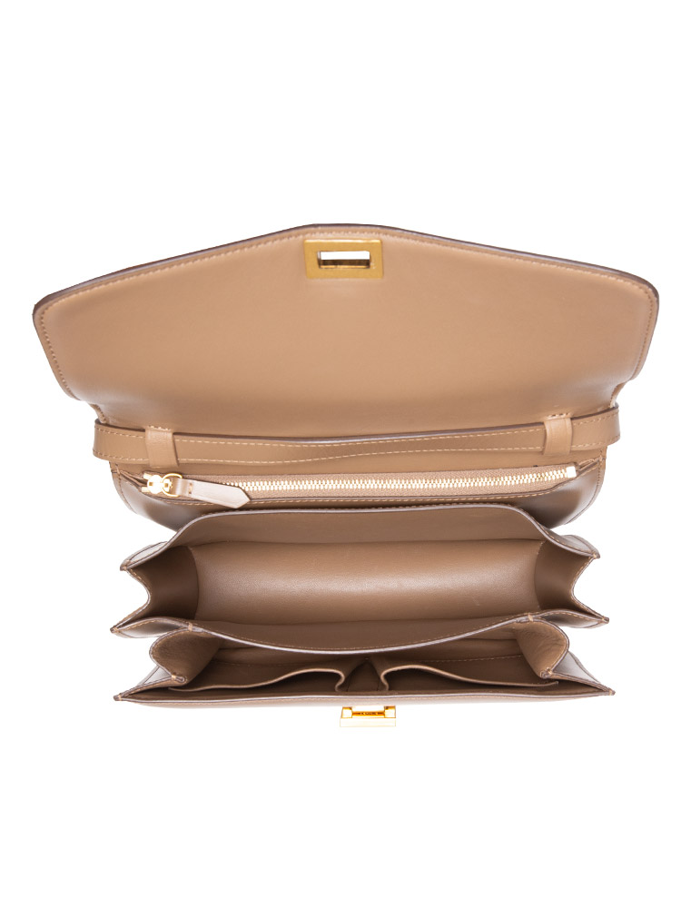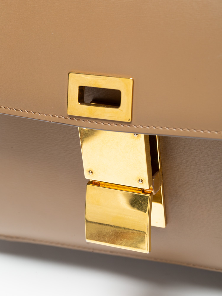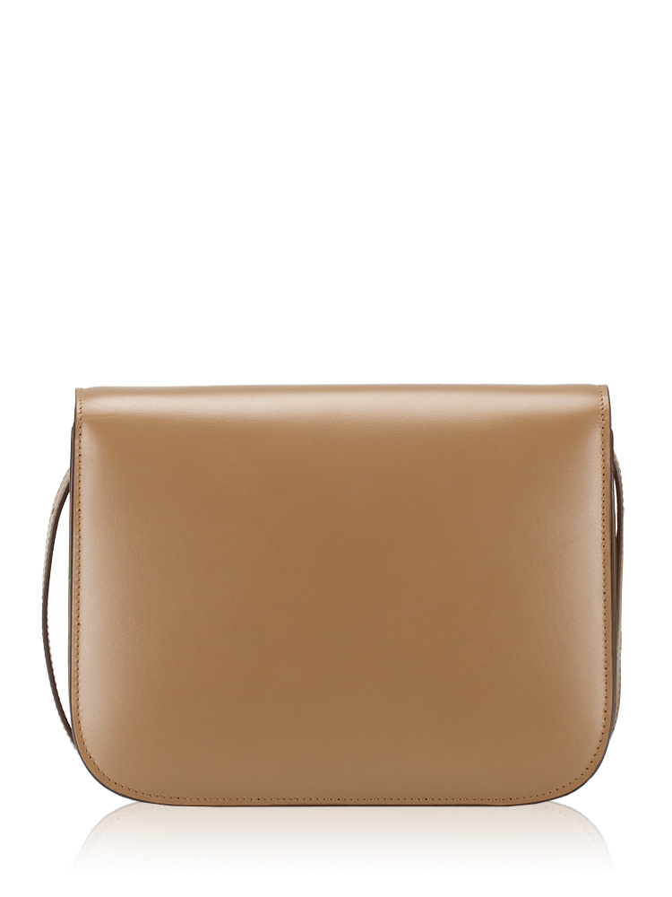 Crafted of smooth calfskin leather. Features a long adjustable leather shoulder strap and a frontal gold press lock. This opens the flap to a partitioned leather interior with patch pockets and a zipper compartment.