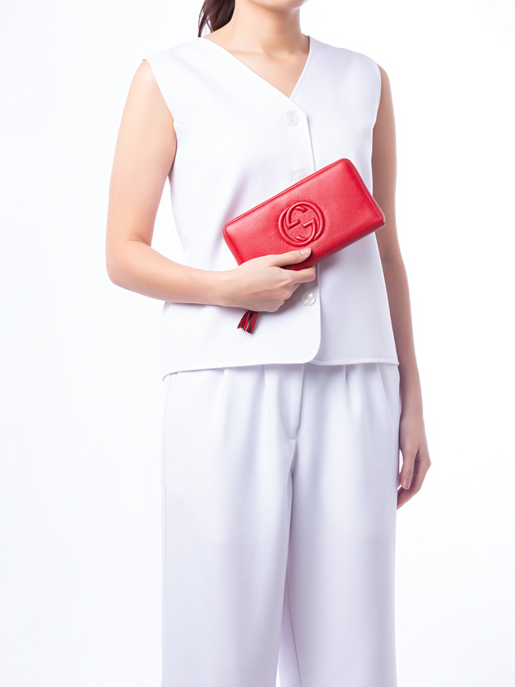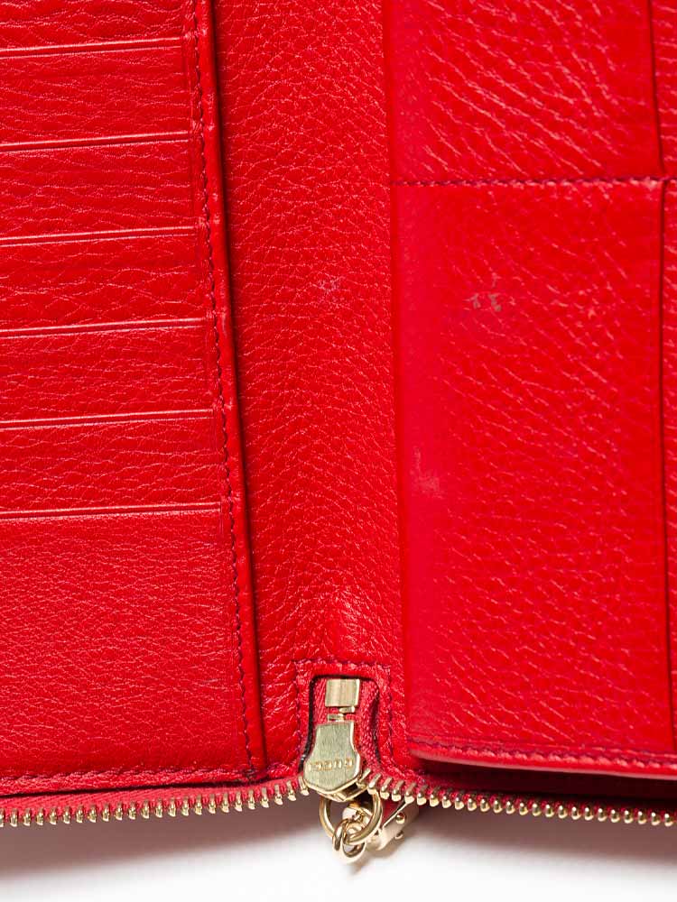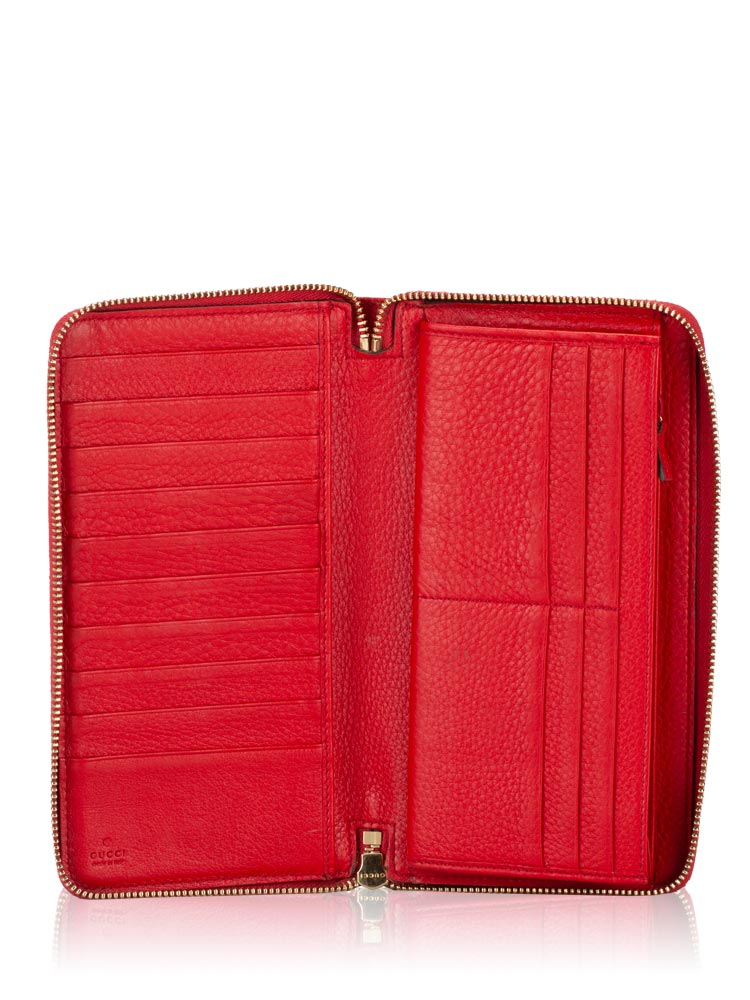 Crafted of fine grained leather with an embossed interlocking GG logo. The wallet unzips with a tassel pull to a matching leather interior with card slots and a zipper compartment.