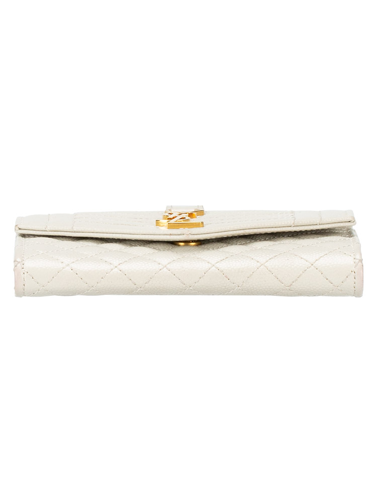 Crafted of chevron-quilted leather. The wallet features a facing flap with a prominent polished gold-tone YSL logo and an exterior rear pocket. The flap opens to a leather interior with card slots and an compartment.