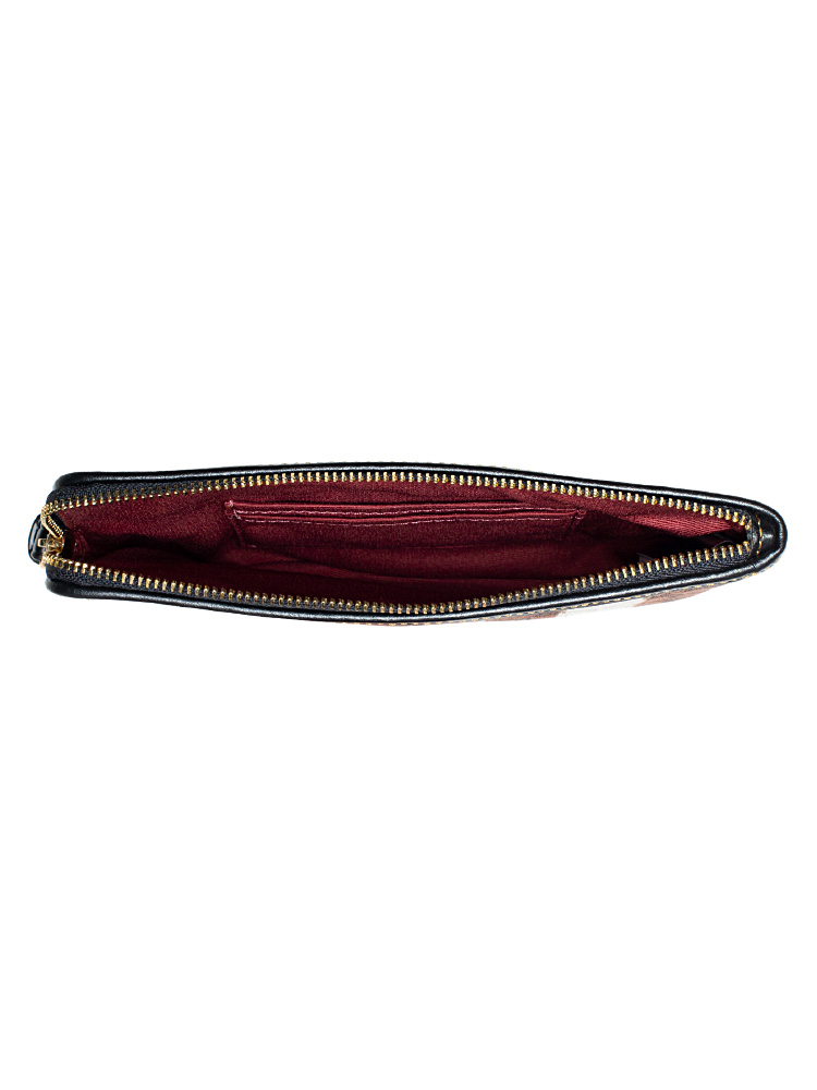 Signature jacquard and smooth leather. Two credit card slots. Zip closure, fabric lining. Wrist strap attached.