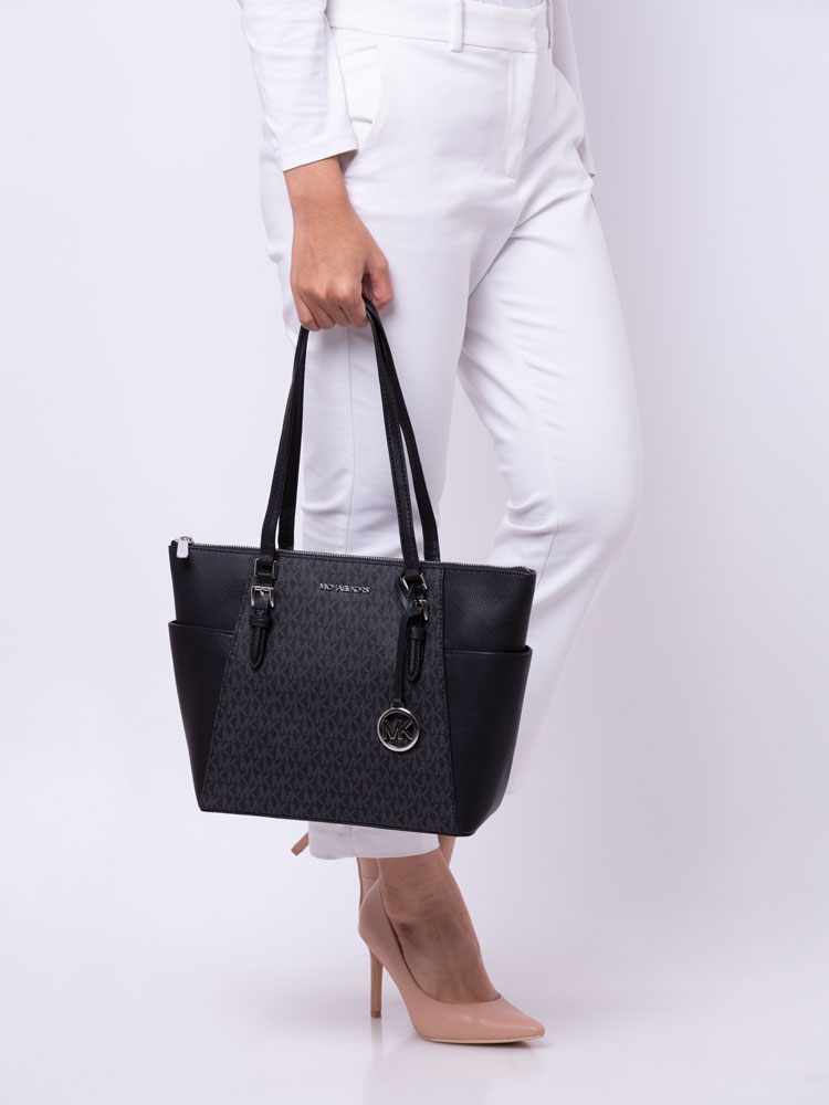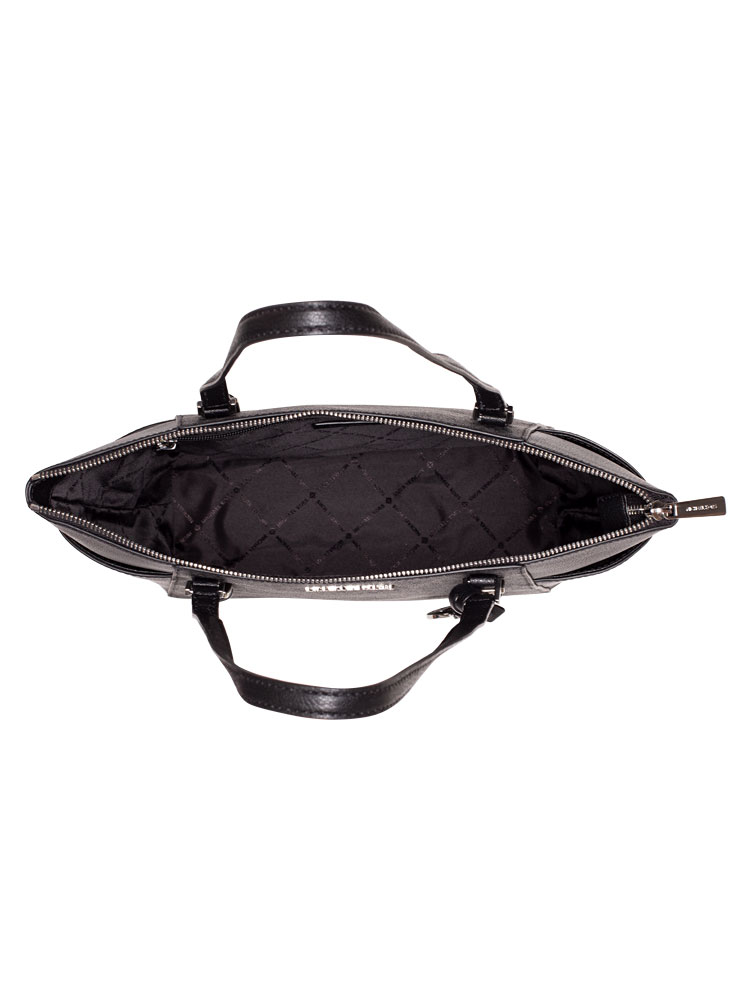 Made of coated canvas and leather. The bag features a zip closure that opens to polyester lining with one zip pocket, exterior two side pockets, double handles strap drop 34 cm.