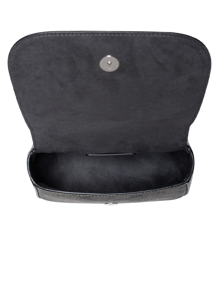 Made of coated canvas. The bag features a flap magnetic closure that opens to suede lining with two card slots, exterior one slip pocket at back, adjustable and removable long strap.
