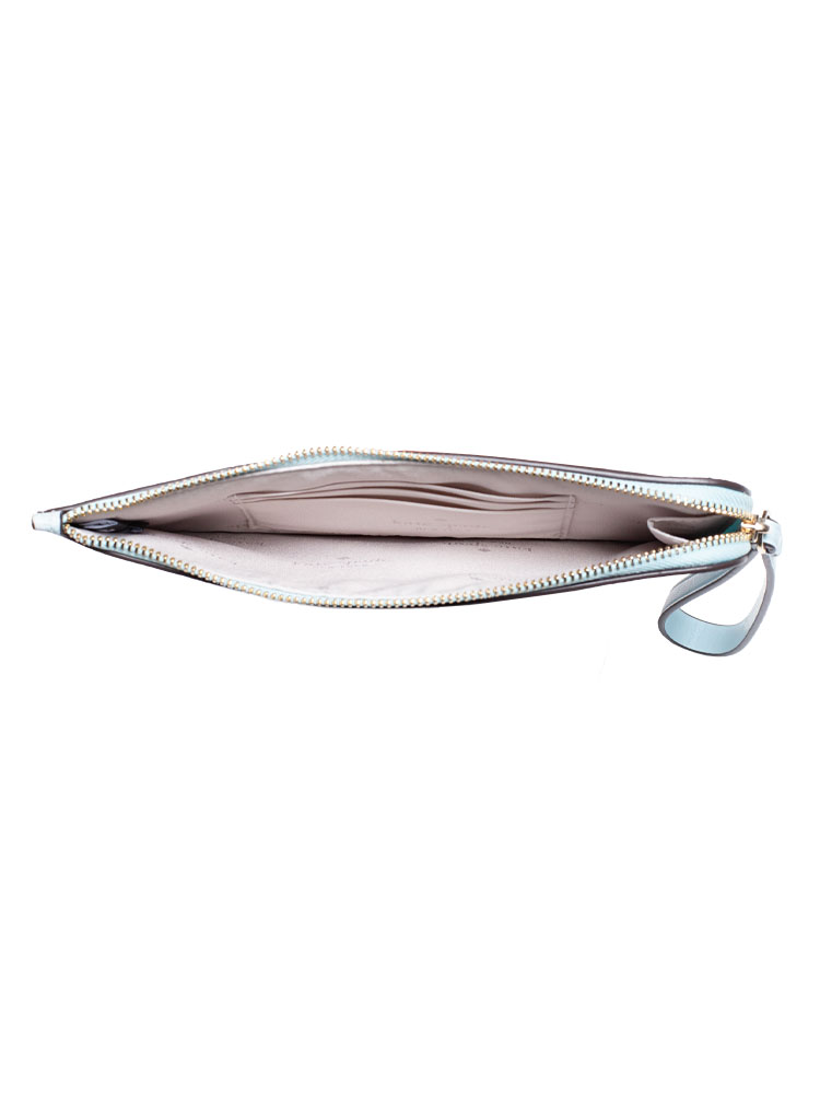 Made of spade flower pvc. The Wristlet features a zip closure that opens to polyester lining with interior three card slots and exterior one slip pocket at back.