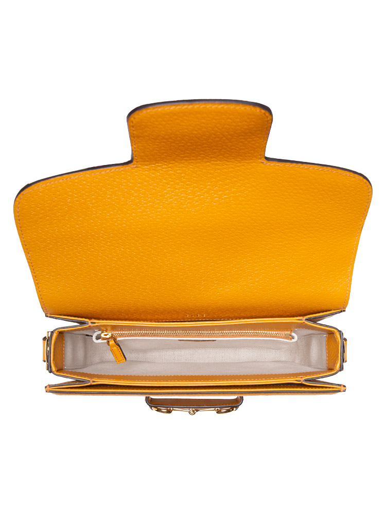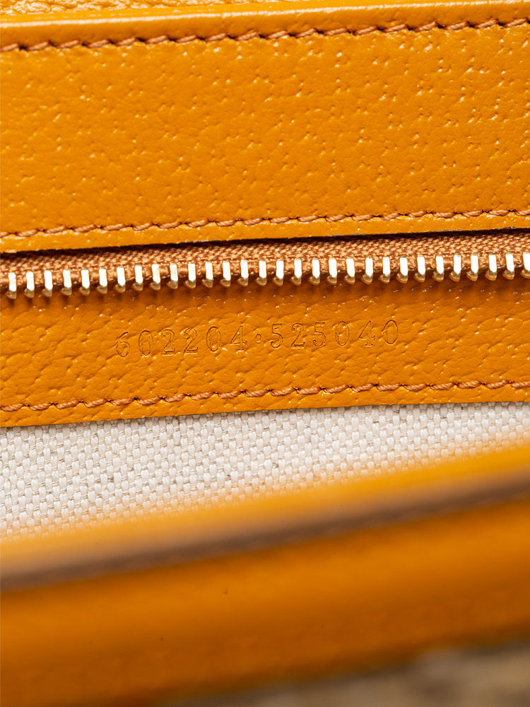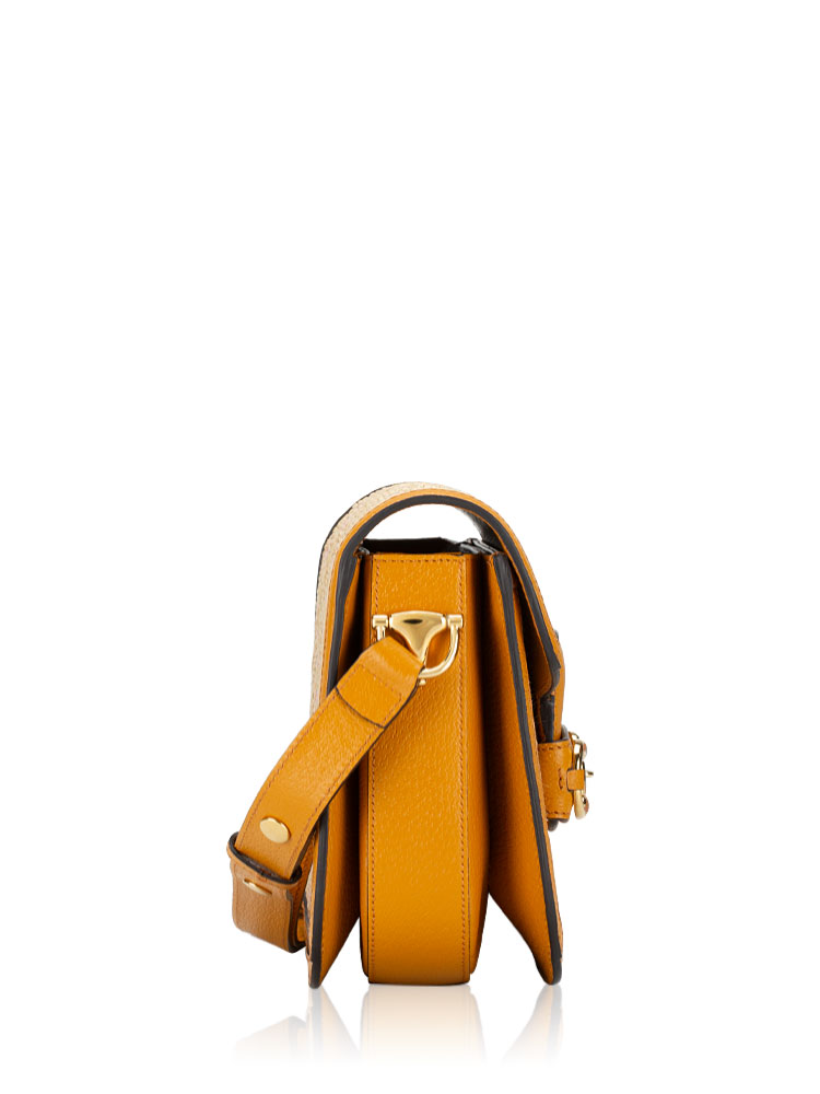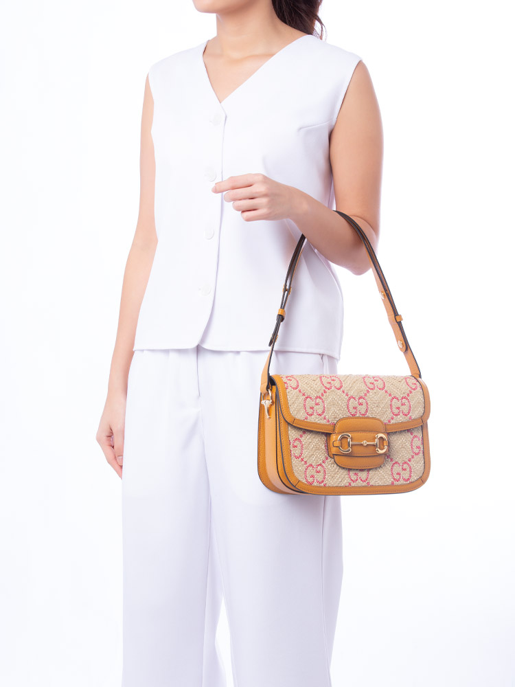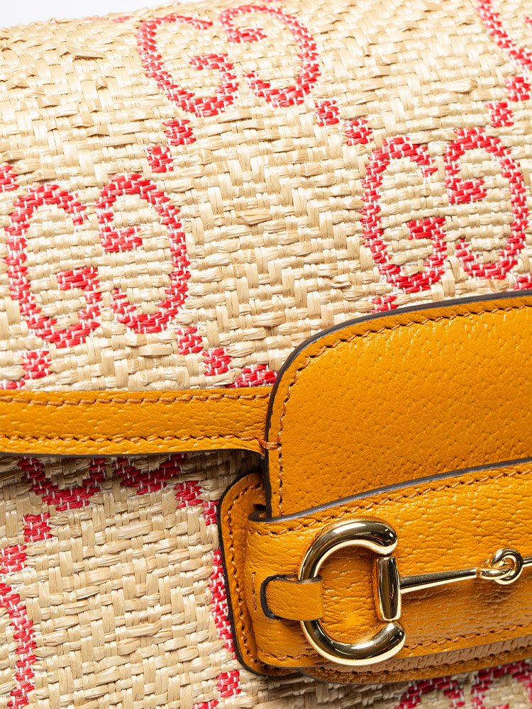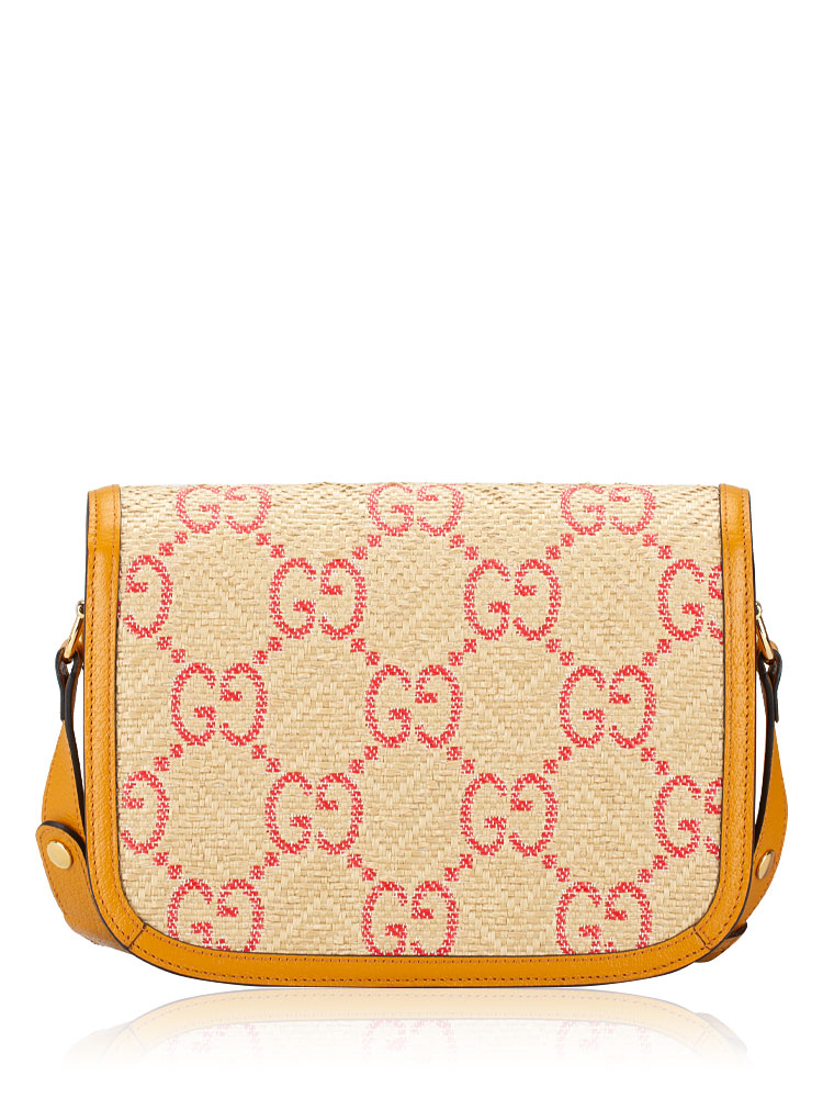 Crafted of raffia with the Gucci monogram and leather trim. The bag features a matching leather strap, and a gold horse-bit detail on the front. The flap opens to a microfiber interior with a patch pocket.