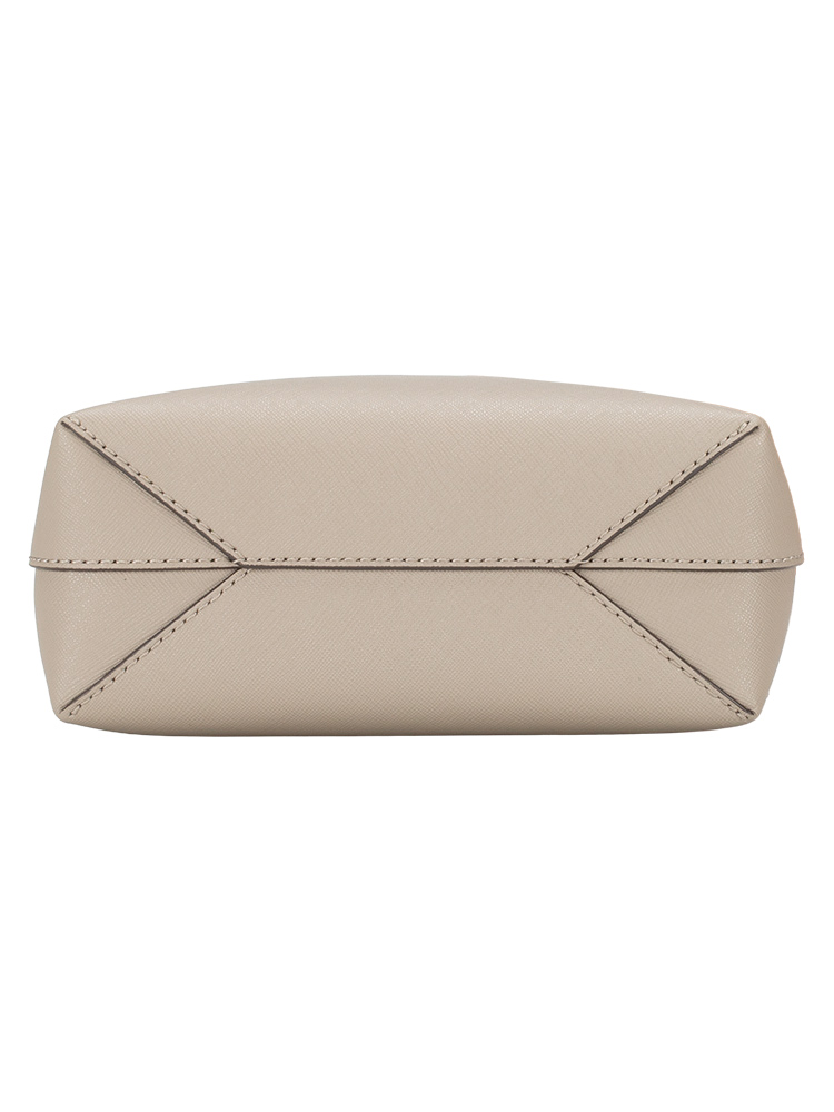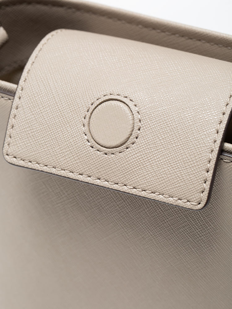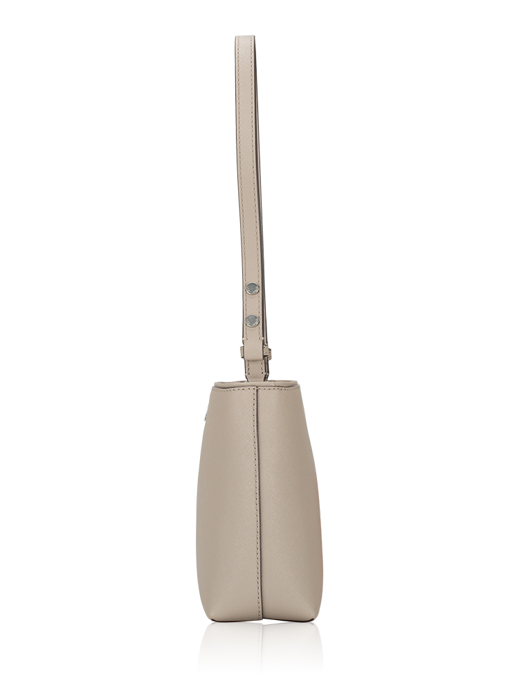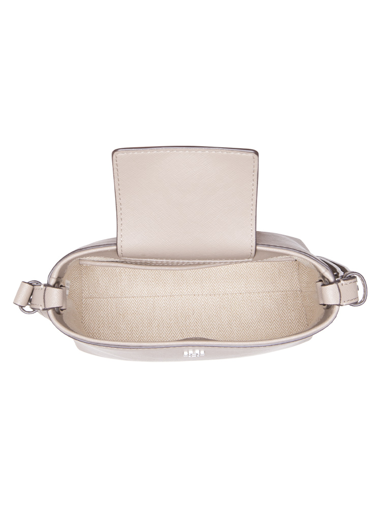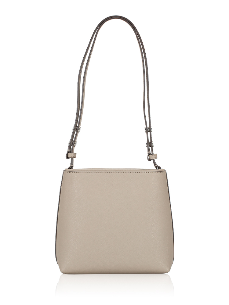 Made of saffiano leather. The bag features a magnetic snap closure that opens to fabric lining with interior one slip pocket, adjustable strap.