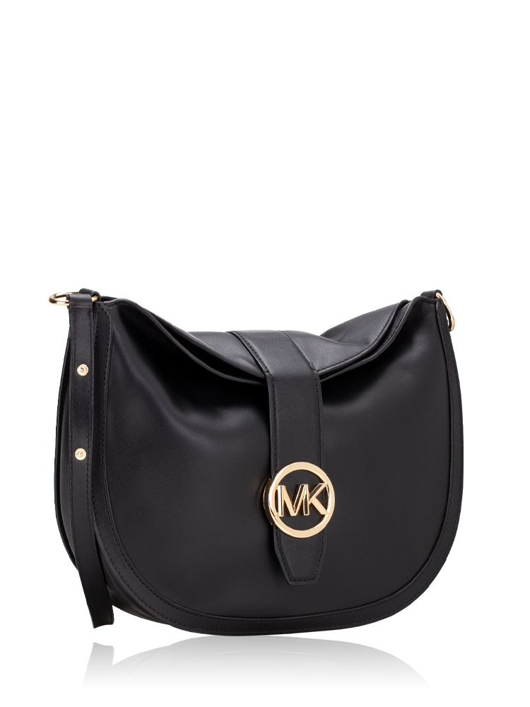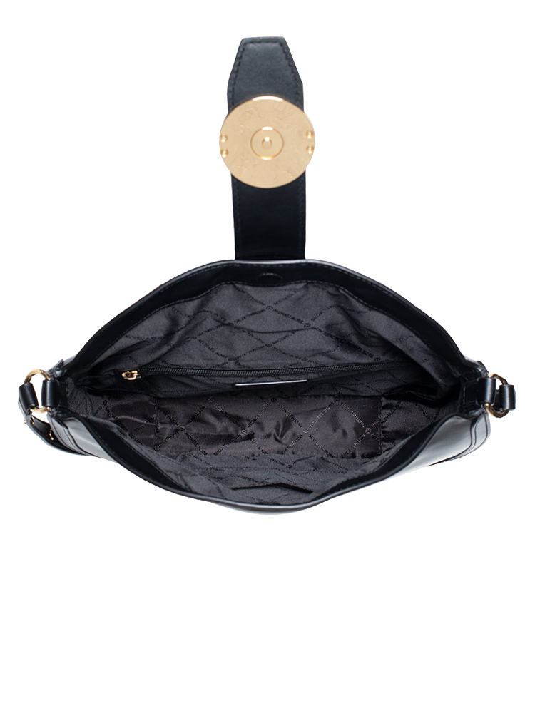 Made of smooth leather. The bag features a magnetic closure that opens to polyester lining with one slip pocket, one zip pocket, adjustable strap.
