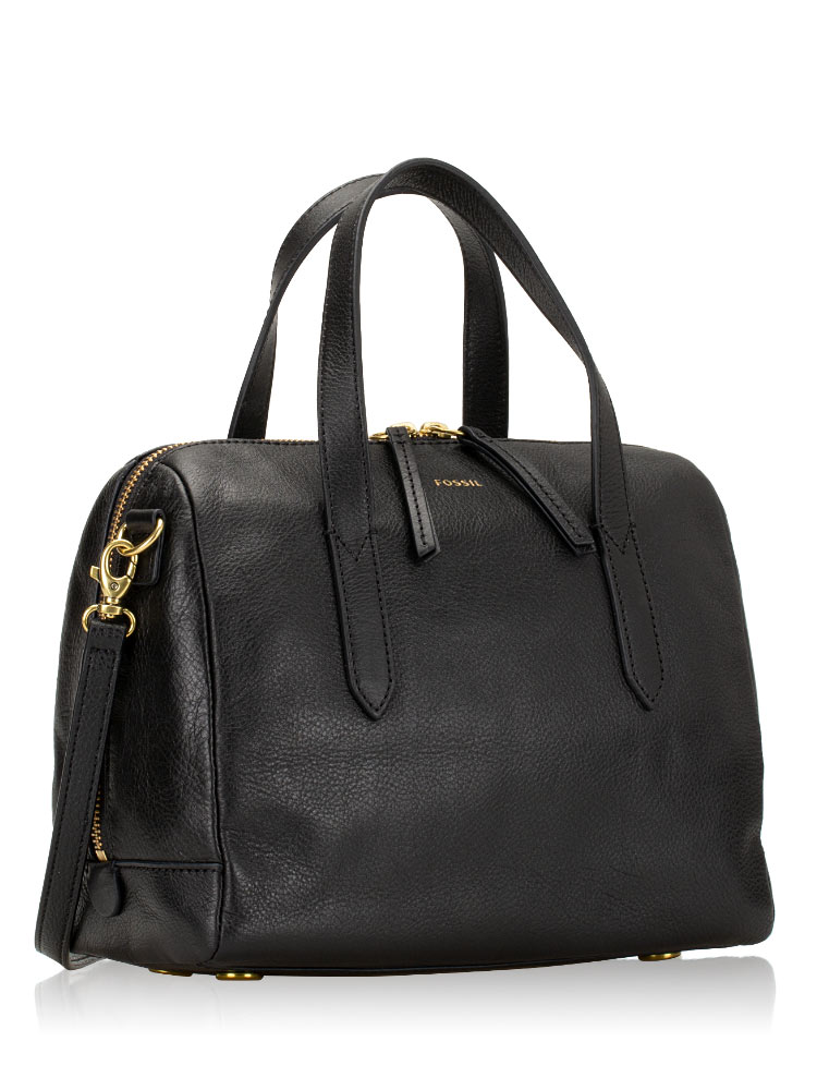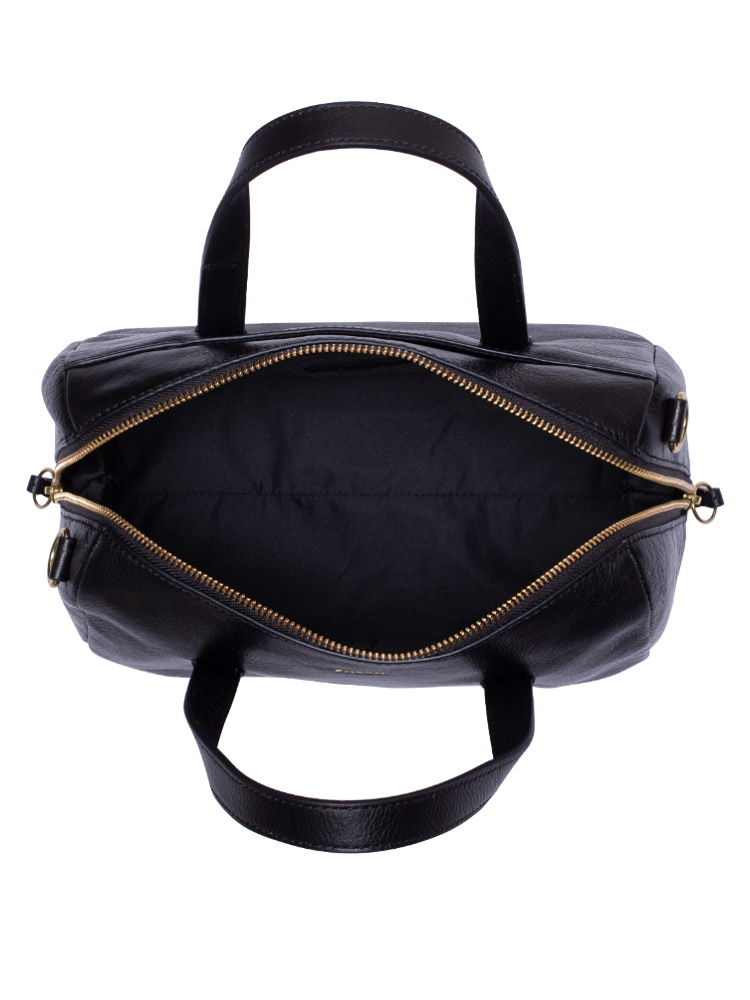 Crafted of cow leather with fabric lining, the bag features old brass hardware, double handles, a zip closure, a fabric interior with double slip wall pockets and a zip wall pocket. It also has an exterior slip pocket and comes with optional long strap.