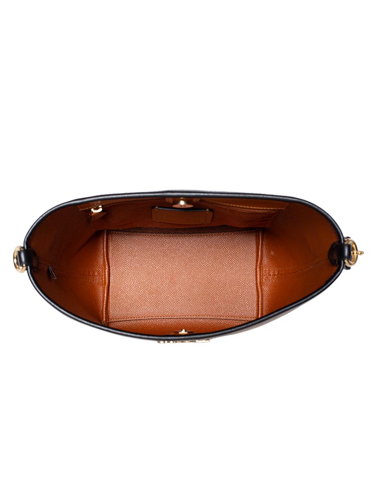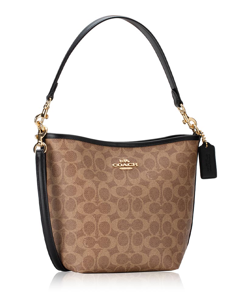 Made of signature coated canvas and smooth leather. The bag features a magnetic snap closure that opens to crossgrain leather and fabric lining with interior one zip pocket.