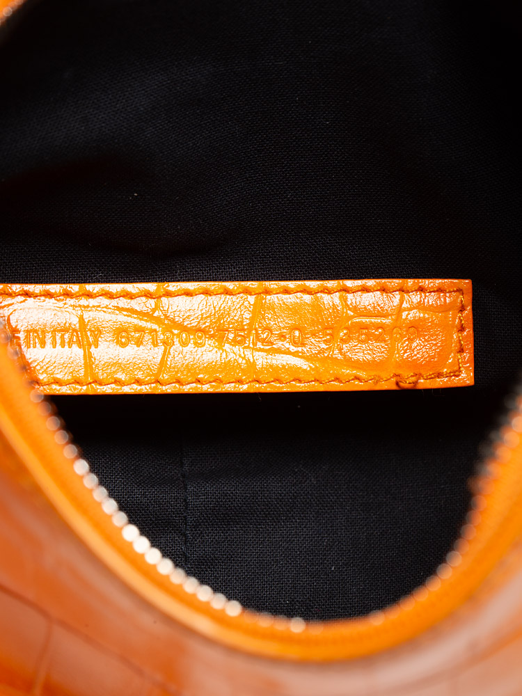 Crafted of crocodile embossed in calfskin leather. The bag features a sturdy leather top handle with silver links and a top zipper, and an adjustable shoulder strap with mirror and zipper coin purse. The top unzips to a fabric compact interior.