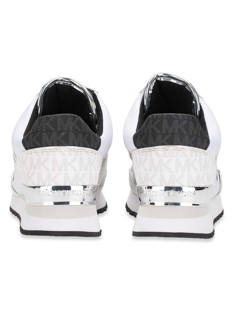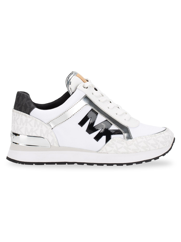 Our Maddy trainer is a sport-luxe style with a sophisticated touch. Designed in a classic silhouette, it features two-tone panels of Signature-print canvas with smooth and high-shine metallic accents .
