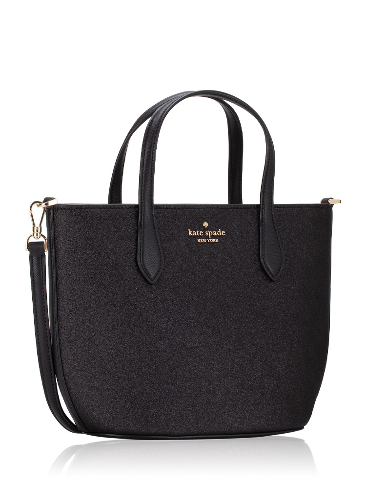 Made of Glitter and fabric. The bag features a zip closure that opens to polyester lining with one slip pocket, one zip pocket, double handles drop 11 cm, adjustable and removable long strap.