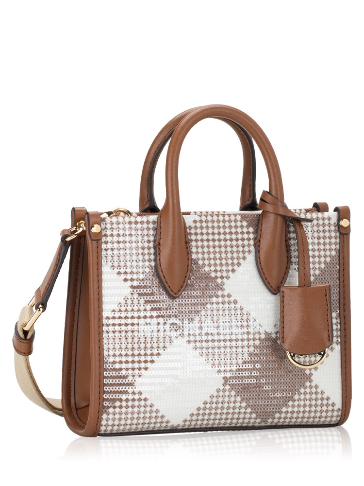 Made of leather and sequined. The bag features a zip closure that opens to polyester lining with one slip pocket, double handles drop 7 cm, adjustable and removable long strap.