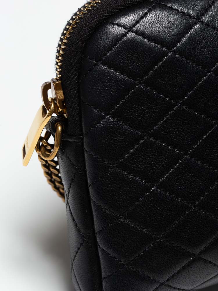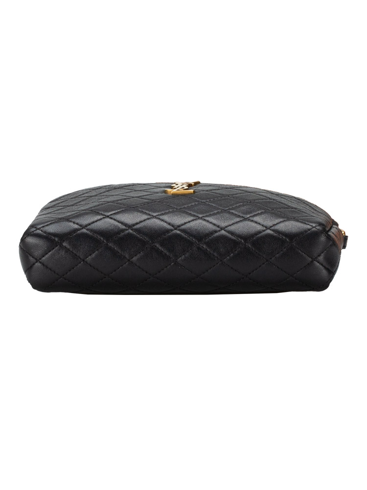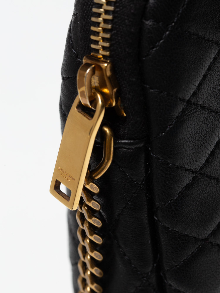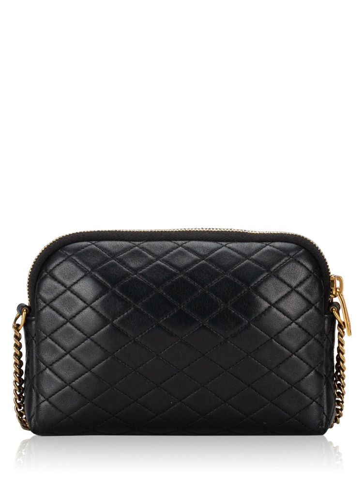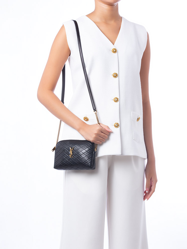 Crafted of diamond quilted lambskin. Features a leather and aged gold chain shoulder strap and a signature prominent aged gold tone YSL monogram detail. The top zipper opens to a leather interior.