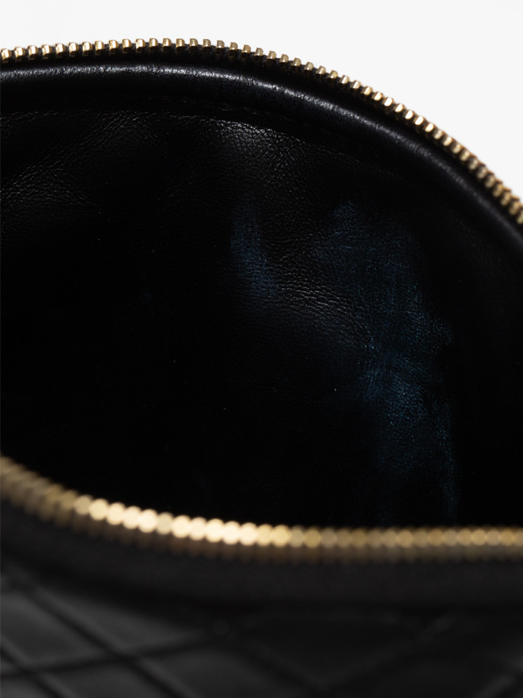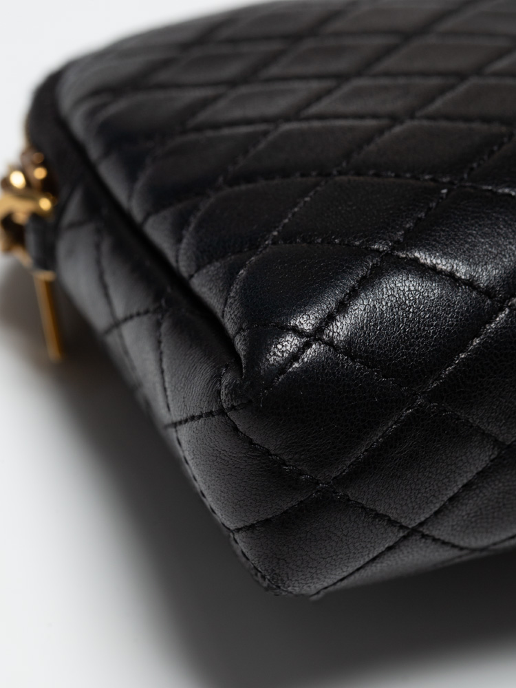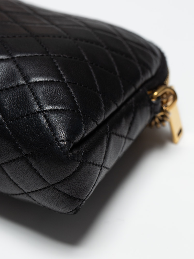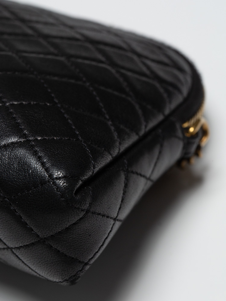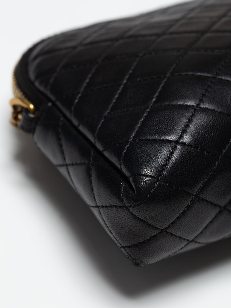 Crafted of diamond quilted lambskin. Features a leather and aged gold chain shoulder strap and a signature prominent aged gold tone YSL monogram detail. The top zipper opens to a leather interior.